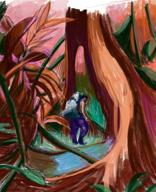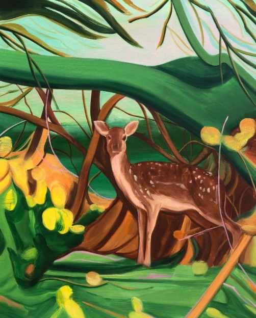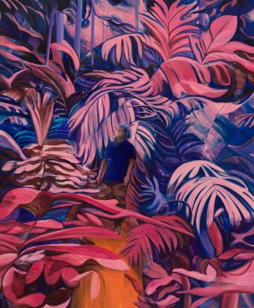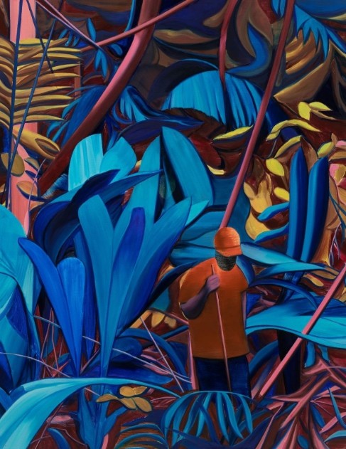 这些画面的母题多来自艺术家在缅甸丛林时所拍摄的图片,在描绘中,他还巧妙地植入了诸多艺术史和当代视觉文化的元素。 祁磊笔下的丛林是象征性的,所以,我们看到的不光是绿色的丛林,可能是一片蓝色基调的丛林,或是一片赭石色基调的丛林,也可能是一片紫色基调的丛林……蓝色赋予了野蛮的丛林浪漫的诗性和幽暗之光,赭石色象征着起火的世界和化为焦土的地球——即使丛林也未能幸免,而紫色则是希望在已然被世俗化的原始场景中召唤出某种神圣性和荣耀感……