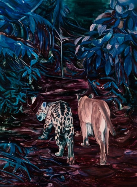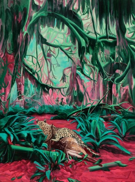 画中的人物(多为旅者)和野兽原本是丛林的有机组成部分,但在这里,都是伺机寻找生路的意外的“闯入者”,也许,就像这些已然异化的丛林一样,他/它们只是幸存者。 不难洞悉画面中波提切利、库尔贝、高更的影子,但在这里,艺术史也成了幸存者。 不知所踪的旅者忘掉了恐惧和不安,连豹子和狮子这对天敌也都开始结伴觅食了……祁磊的画面中虽然没有血腥和杀戮,然而,这种迷失感和荒诞感或许是现实世界最深刻的寓言。