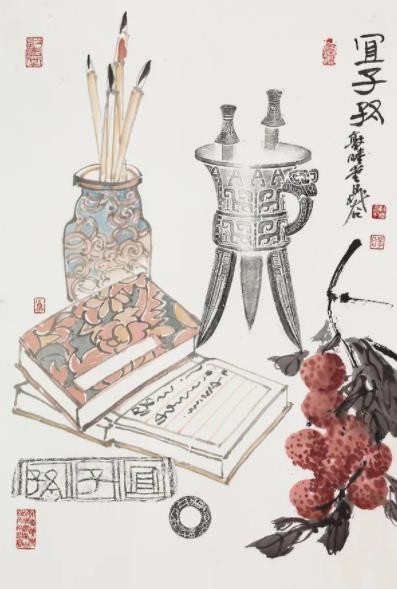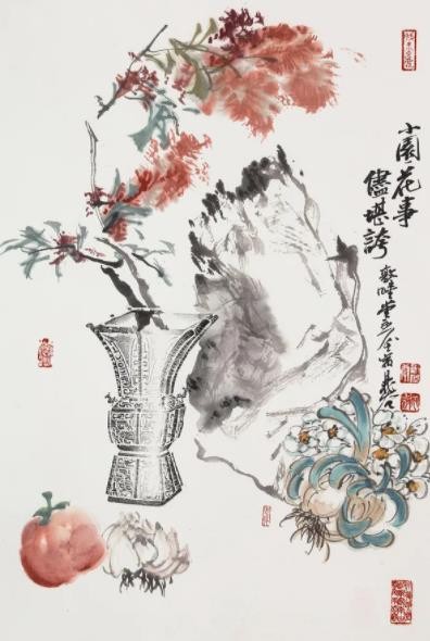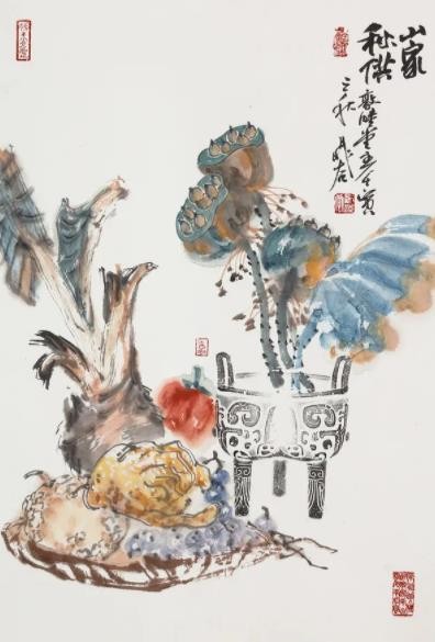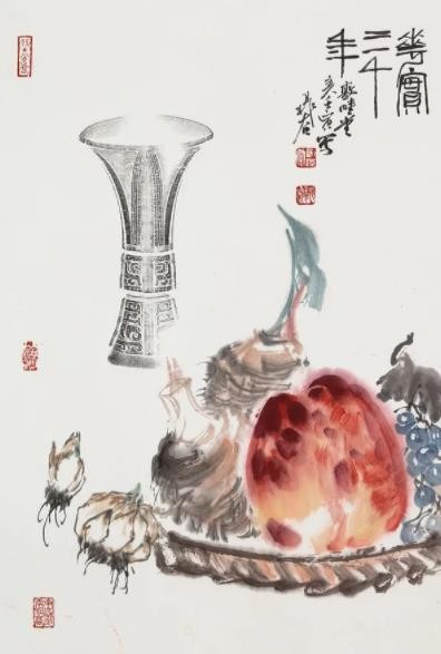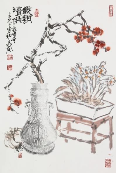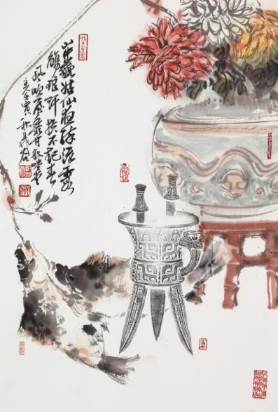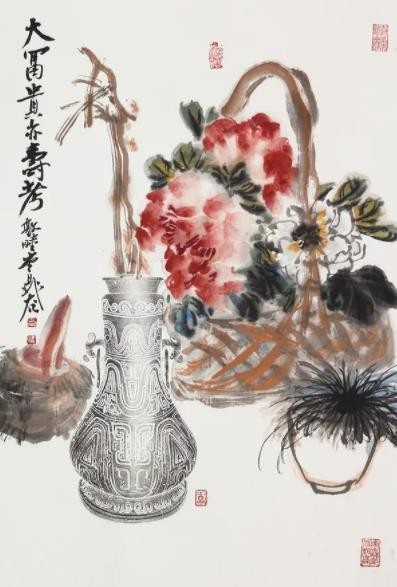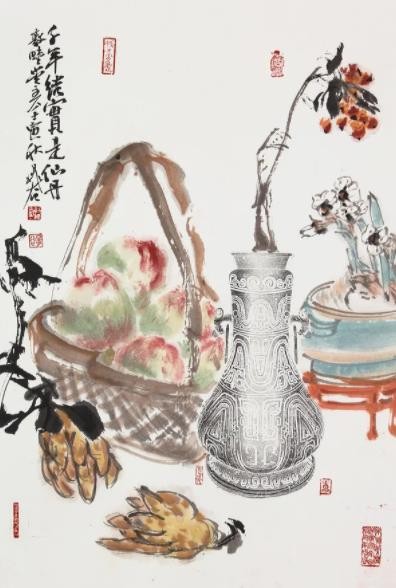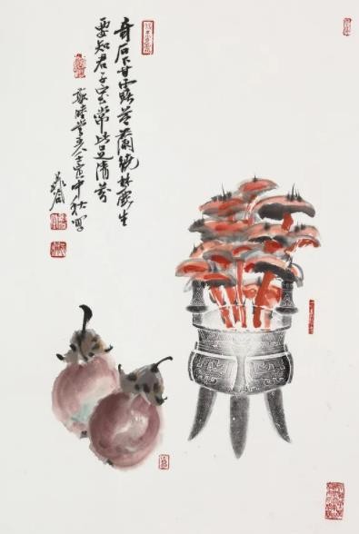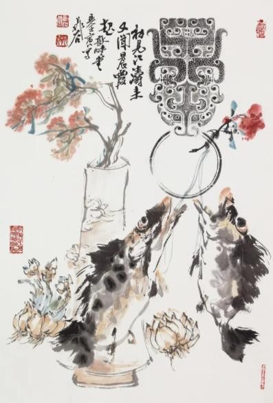 仔细品读晁谷的这批作品,能够感受到画家在构图上“妙手天成”的超高天赋,各种灵巧又不失法度的位置经营,妙笔迭出,令人赞叹不已!更难得的是,他继承了海派画坛的一个传统:雅与俗并不是创作中关注的重点,而是经过市场的打磨,用很多技巧去营造氛围,强调意趣,能画出铮铮的傲骨,也能画出烂漫的天真,再结合青铜器拓片本身所具有的历史感,以及王者风范,可以说是惊才绝绝,举世罕有!