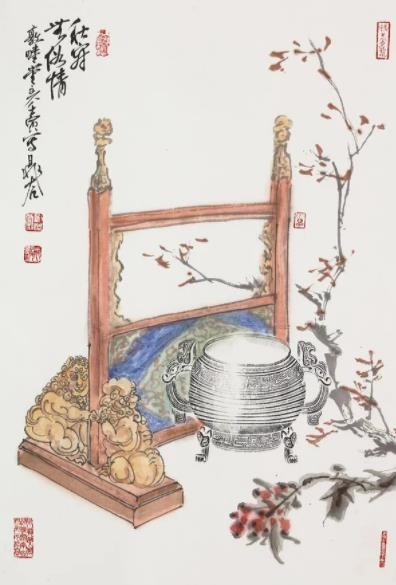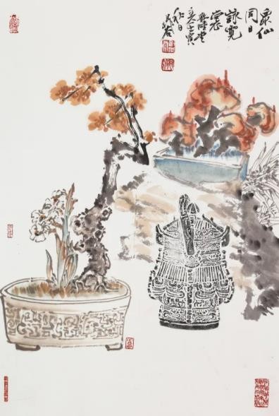 这批“拓片花鸟画”就是他最新的一个尝试,此次画展的主题“金石为开”也同样是有了新的涵义:青铜器为“金”,汉砖为“石”,二者在岁月的侵蚀下,会散发着盎然的古意和沧桑的美感,我们经常提及的“金石气”也在这批作品中找到了很好的示范。