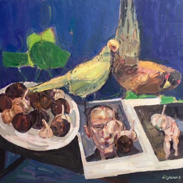 俞林的探索沉心于个人的审美世界,无论在孤寂式的静物还是在静默式的风景中,那股自我的纯粹性,那份笃定内敛、温文典雅、沉静脱俗的书卷之气,透射出当代文化人的生存境遇和对生命价值的终极追问。王英凯的油画《众生》系列,则以一种直观而简洁的造型和夸张而夺目的色彩,表现出 “众生”被凝视的那种摆拍式的淡定自在和无处安身的内心彷徨,暗示了网络自媒体时代作为社会人的过渡彰显和作为自然人的迷茫或迷失。