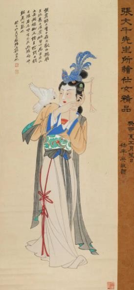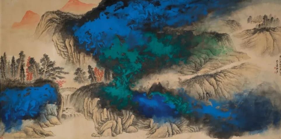 他的画风工写结合,重彩、水墨融为一体,人物、山水、花鸟无所不能。从仿古山水到氤氲混沌的半抽象风景;从弱柳扶风的明清仕女、古代高士、自画像,到佛教题材的宗教人物画;以及生动活泼、简笔写意或精工的花鸟、鱼虫、走兽等,大千先生都各臻化境。晚年更是手辟鸿蒙,以中国传统泼墨为基础,在中西艺术碰撞融合的语境中,将传统山水画带入了泼墨、泼彩的全新境界,直与造物游。不止于此,作为最负盛名的国画大师,张大千1950年离开大陆后,旅居欧美等地,足迹遍布全球数十国家和城市,数次海外办展,不仅是蜚声国际的艺术巨匠,也是将“中国美术推向世界的第一人”。