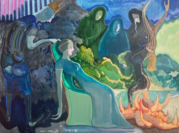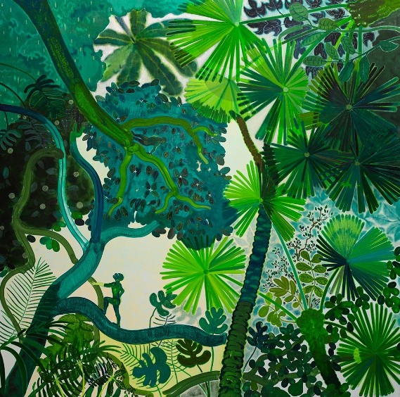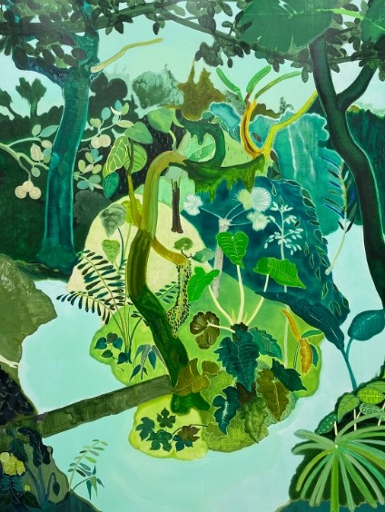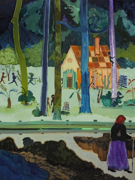 但他画中一再出现的大自然,并非风景画,而是景观的代码,一种填充画布空间的色块需要。当他画的人物或远或近活动于虚拟的山谷、湖面、岩间、林中,画面有如放大的卡通或数码空间,藏着暧昧的隐喻,而其中的叙事,被简化,或被模糊了。