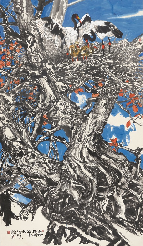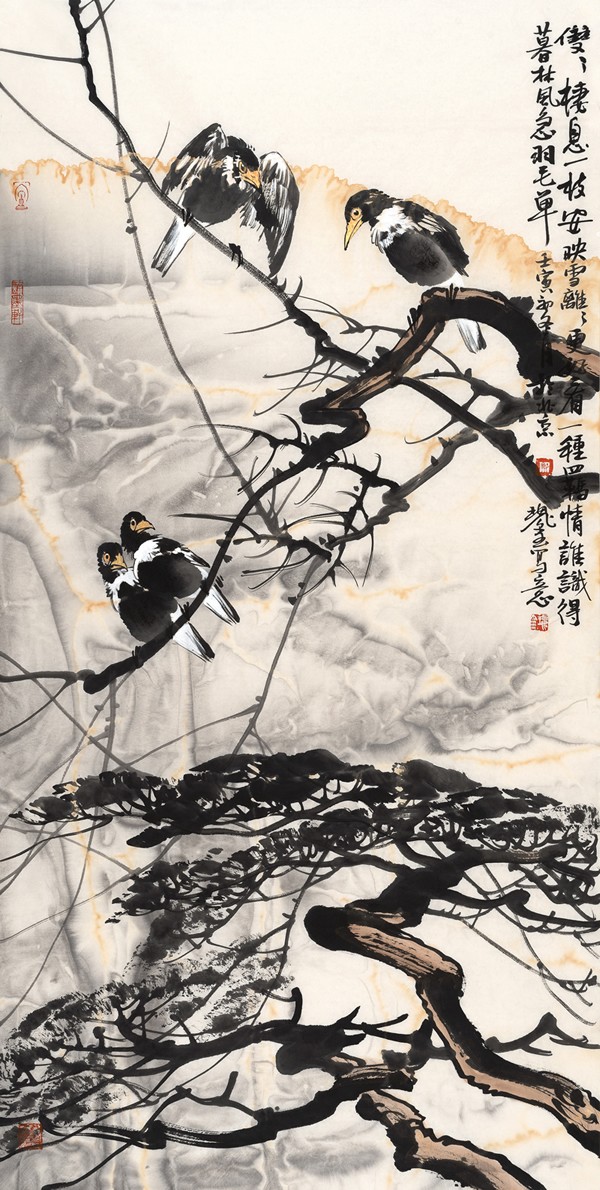在季老师耳提面命的悉心教授下,这位农家少年终于蜕变为一个青年艺术家。他怀揣着对艺术世界的憧憬,如饥似渴地寻找一切学习的机缘,终于赶上了艺术蓬勃发展的新时代。20世纪90年代初,在多元的现代风潮中,他反过头重新钻研工笔画,他的《夏木林中听泉语》、《梦里南国》、《斑斓之秋》等工笔作品甫一面世,即引起花鸟画坛的关注。此后他又一改工细的造型手法,兼蓄陈淳、徐渭、八大的水墨情趣,终于形成了自己独有的半工半写的绘画风格。潘天寿言:“不同才是艺术。”回忆到这段反刍的研学经历,郑瑰玺说那时候就是想通过深入传统、扎根传统,为艺术寻找一条属于自己的路。