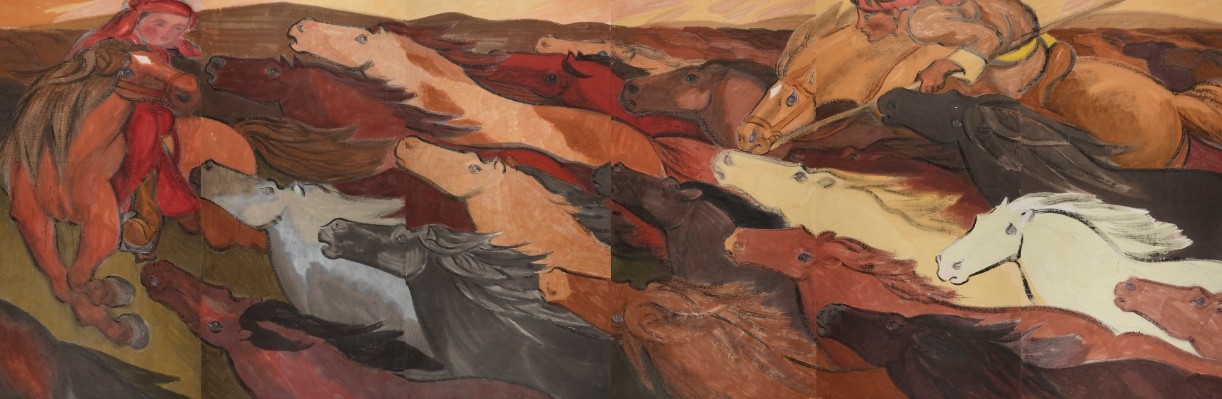 这一次展览的主题是和平与故乡。刘巨德偏好两个形象:鸽子与少女。他画过无数的鸽子和少女,在他笔下,二者完全合而为一,成为纯美至善的象征。刘巨德说过,艺术家不仅要提供美,还要提供慈与善,以慈观世,以善作画。鸽子与少女的形象,俨然成为刘巨德的精神图腾,他以这个图腾的反复创造来宣扬和传播老子“以慈为宝”的和平主义思想。他也画马,既画草原的野马,也画北朝和唐代鞍鞯华丽的舞马。他厌恶战争但崇拜英雄,因为英雄能够牺牲自己止戈为武捍卫和平。马就是英雄的象征,是刘巨德的又一个精神图腾。