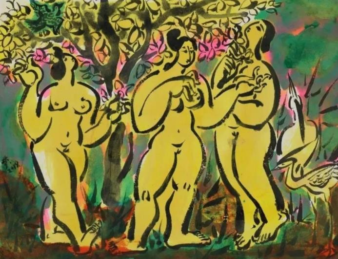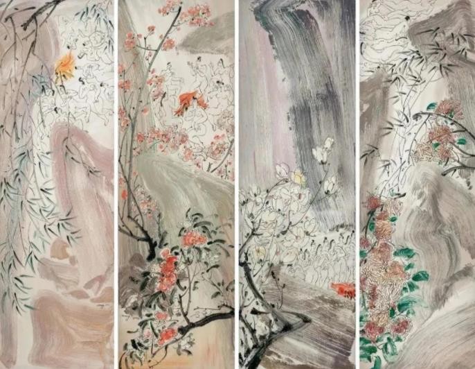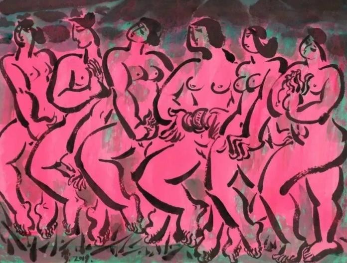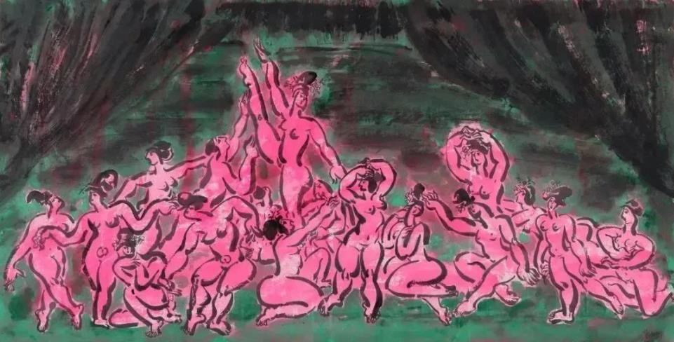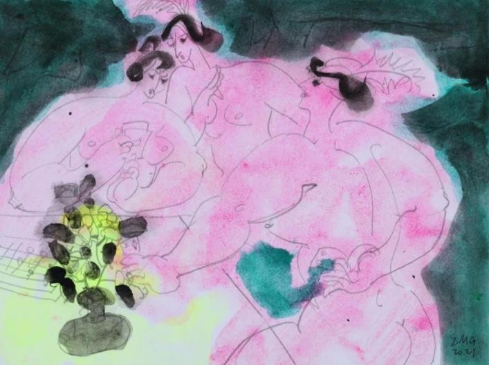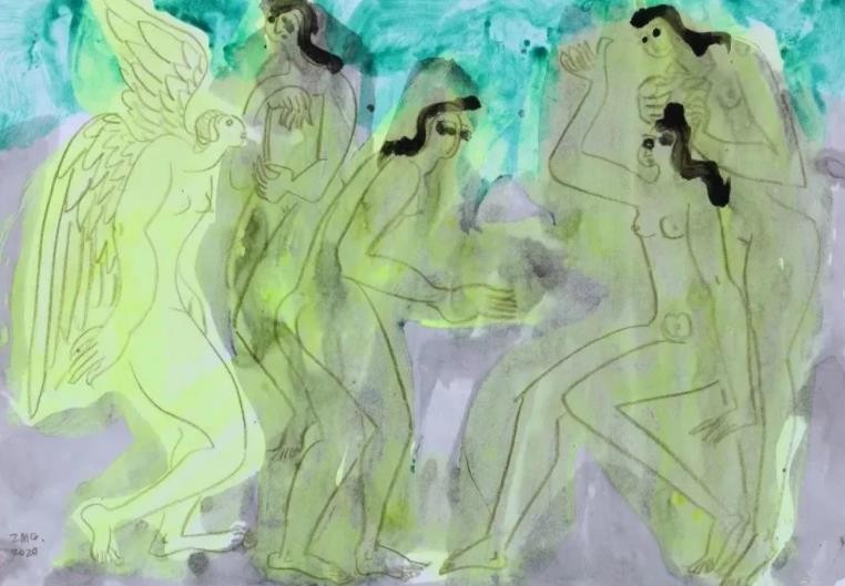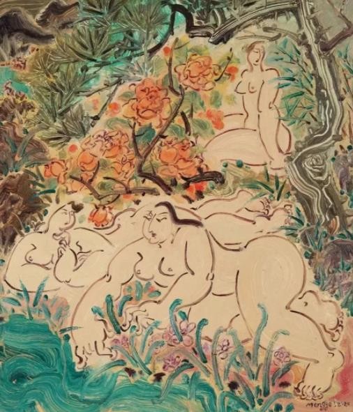 从赵梦歌的绘画和图像语义的角度来看,她的作品具有一种个体性在时代环境中的精神念力,包含对成长记忆的回溯和身心并力的真实结合;继而以此线索输出个人对现实生活的内在关照和感官的情绪表述,在感性和理性并置交融的绘画之中,为观者诠释了人与自然在外部场域下的生命联动,由身体通往心灵共振的密码通道。“云梦天歌”不仅是我对画家阶段性作品的整体描述,非指向性的人体与山水、植物符号替代了我们所未视见的景观图景,另一个层面而言,也是她更为具体的与自然生发的一种互动方式,“从一而终”的叙事情境状述了画家恣意而跳动的语言形态,韵律性的造型人物,在富含节奏性的情绪调动中,皆付诸着赵梦歌对于生命和自然的深入理解。