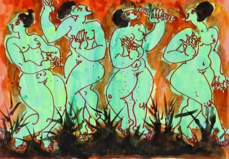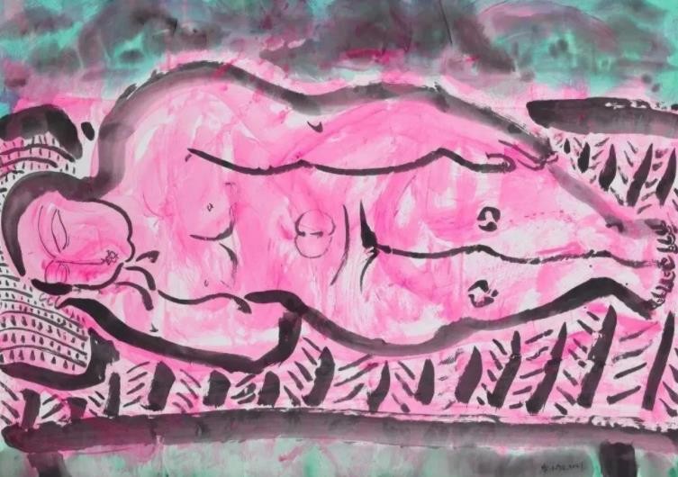 直抒胸臆而果断的表现形式,加强了个体语义的语言深度。图像阐释的表义背后,注入了画家“表里如一”的心绪定格,图像背后的力量更加强了画面中人物形象的自然姿态。由纸本手稿到布面油彩的材料切换,充满野性动态的人性自由度,单一形态的出现,以及三五成群的人物形象,《高地》之上,与动植物的互动生态,在对比强烈的色彩氛围下,愈显画面的内质张力和温度折射。