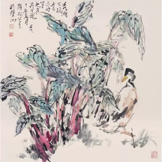 显林先生的写意花鸟画虽承继明末陈淳、徐渭和清代八大、吴昌硕等传统,但常年坚持对景写生累积的坚实功力,使他能在精准把握自然物象的基础上,以精妙的运笔、设色,由形入神地表现物象的意趣,他笔下的荷、竹、梅、苇等花卉清新雅逸,鹤、鹭、鸠、雀自成一家。其笔墨品格脱离了传统意义上文人画的孤芳自赏,更对传统花鸟画审美进行了当代性转换,充溢着饱满、勃发的时代气象,他的作品既受主流学术褒奖,又得藏家拥趸追捧,也就不足为奇了。