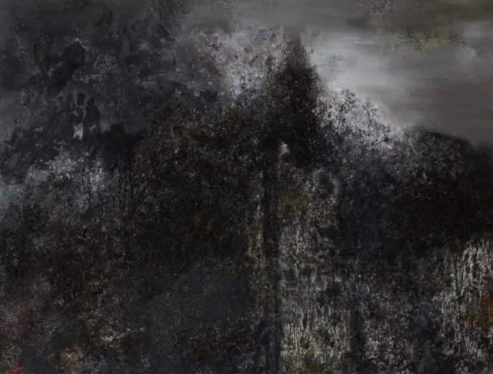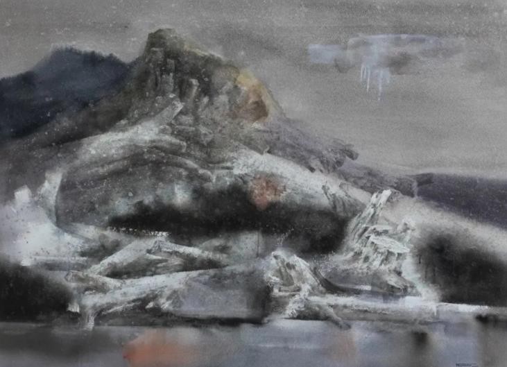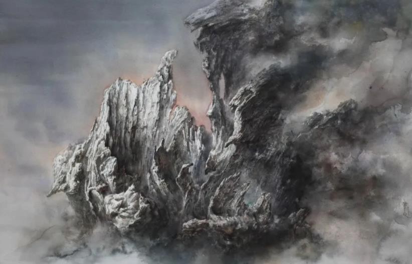 肇友近期创作的《剩山图》系列作为《他山之树可乘凉》系列的延伸,整体画面显得更为坚实、浑厚。他以中国画的用笔去塑造腐朽不堪的老树桩和石头,同时了借鉴北宋山水画图式以及雄伟的画风,将形态各异的朽木、石头局部表现得犹如大山大水般气势恢宏,使得作品具有强烈的视觉冲击力。