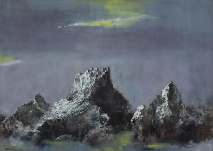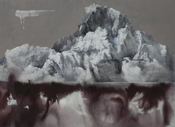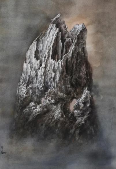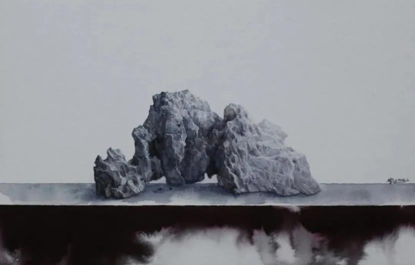 即已经进入了禅宗里的第二境界“见山不是山”;游历山中,对于现实的物象有怀疑的态度,满腹疑团,进入了深入研究的阶段。这批作品以纸本水彩作为媒介,以石为山,或以树为山,结合宋元山水的意趣,加以现代构成的手法;极简直接的构图,精微细致的刻画,让人耳目一新。