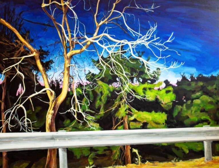 他的绘画始于对快拍中图像和叙事的再现式描绘,在图像空间中,手是在眼的控制下工作的,但由于相机噪点的介入,随机的图像,非清晰的形状,断裂、色块式被引入局部,制造出灾难性的混乱,因此不得已以更随机的笔触,污点,乱画来应对这种状况。随着随机不确定的东西增多,感觉和记忆在图像中的占比逐渐增多。另外,屏幕图像中所蕴藏的不同于现场的信息和文本也不断产生,原本的图像性质发生了转向。如,路灯-烟花,城市-银河,树枝-书法,山峰-纪念碑等。风景借由记忆和噪点逃逸到了一个充满诗意的空间中。