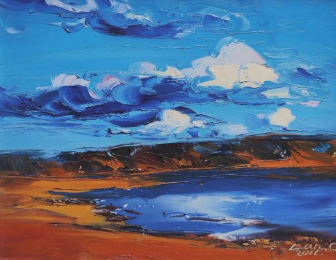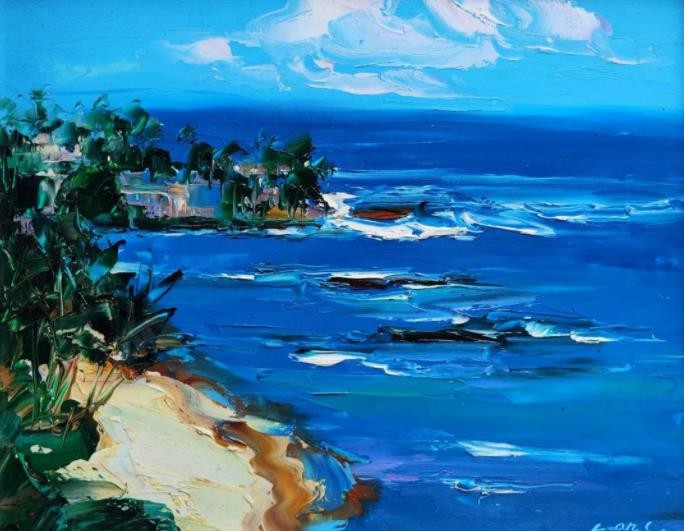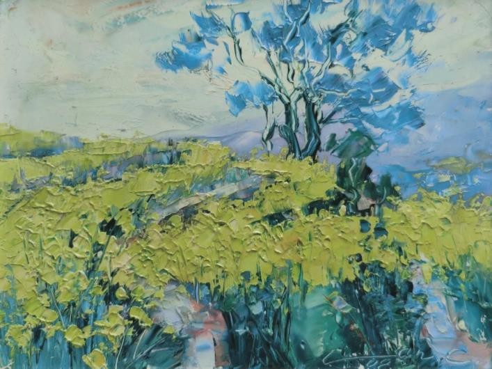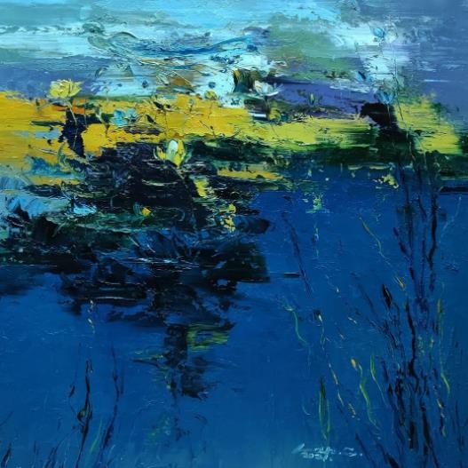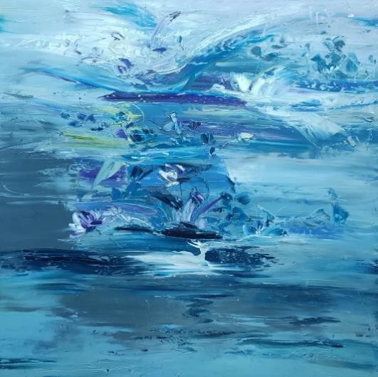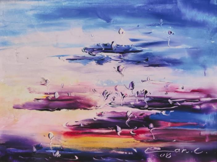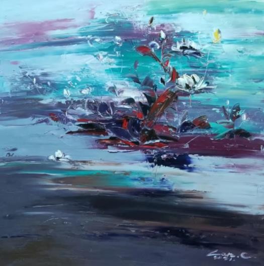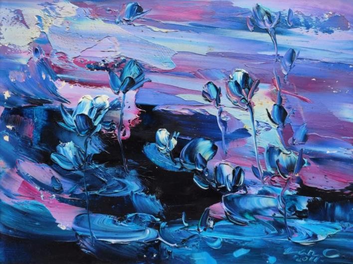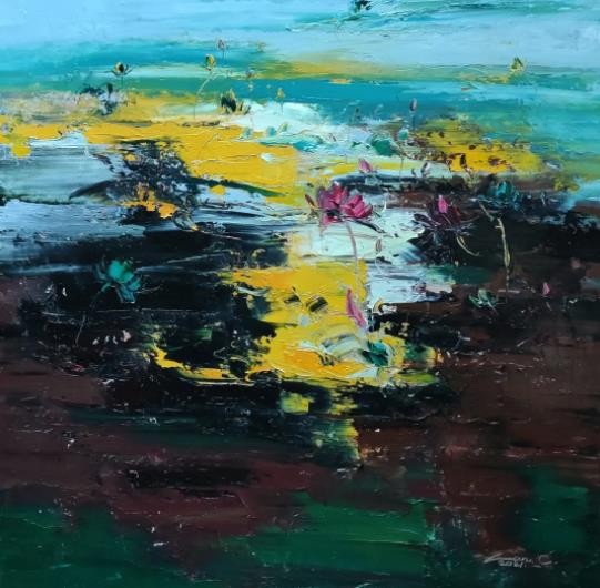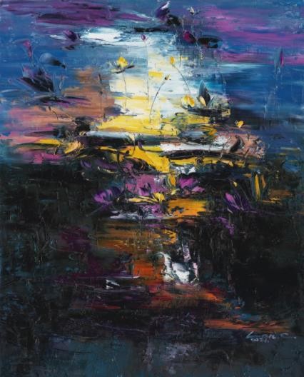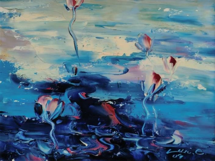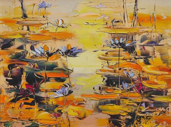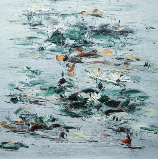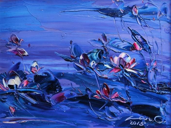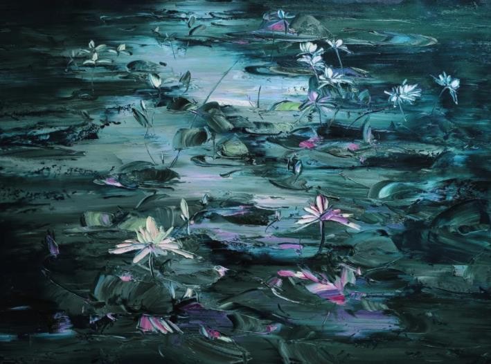 睡莲是我创作了20余年的永恒主题。笔下的莲花千朵万朵,有含蕊孕蕾的《莲之夭夭》,身披霞露的《西子莲》,竞向绽放、压倒群芳的《水中莲》《莲花西来》《莲花心》,落日余晖的《金莲咉日》,月光中翩翩起舞的《水中女神》《舞跳睡莲》,以及静卧素水、半浮面上半沉心田的《蓝莲花》《菊石莲隐》《自在莲莲》。