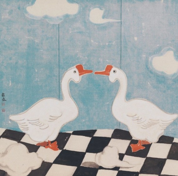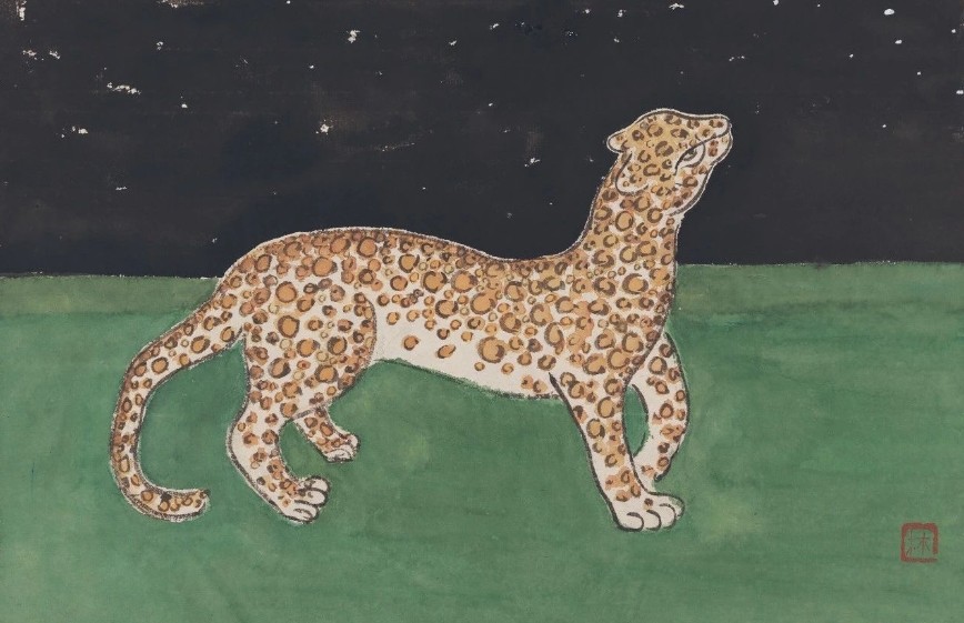 他擅长把舒缓的线条同中国绘画特有的空间意识相结合,用色彩的冷暖、块面大胆分隔、营造作品氛围,把清淡又饱满的颜色平涂在纸上,使整张画面既平实又丰富。