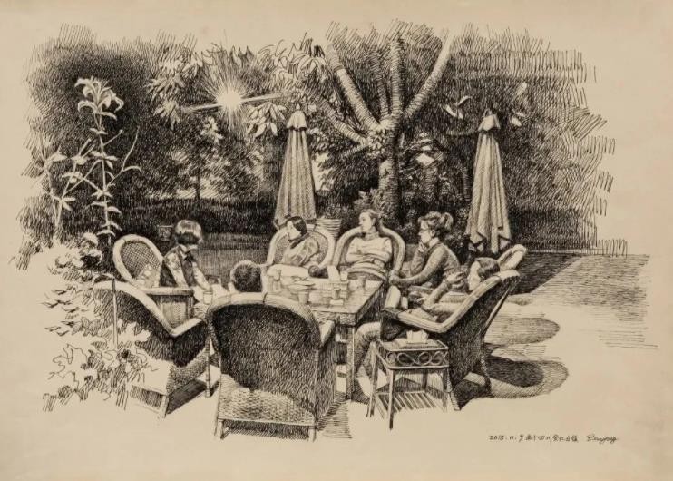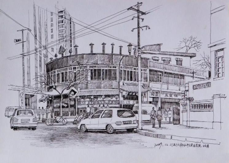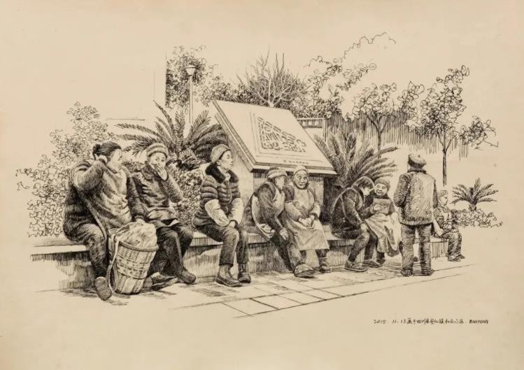 反观班勇的建筑画,我们认为,它们既出之于艺术家个体的自发性,也是在阅尽建筑画史之千帆过后的艺术表征。它们是朴素的,不想有任何夸张,似乎只是为了向我们诉说其曾经确有见到。虽然班勇屡屡被聘作建筑外观设计师并收获了声誉,可是其创作建筑画,在主观上却不是要将它们当成建筑设计的手段,而是仅仅以绘画本身为目的,大圭不雕是他自觉追求的美学品格。他使用钢笔、色粉笔、彩铅和油彩等工具材料作画,但主要以钢笔画来表现建筑,这既是受传统影响的结果,又出于写生便利性的需要。他的画全部是现场写生得来的,其美学信息不仅源自他所看到的建筑对象,也源自其写生所在的时间、空间、环境、物我交感和他个人“此在”的身体和心情。于是,他的画面所转化的,就不仅仅是“看到”,还有听到、触到、嗅到和感到;画中不仅仅是建筑,而且还有人,包括画家自己和在他周围来来往往的熟悉和陌生的人。