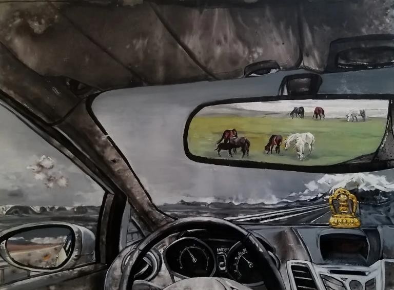 《镜像》系列反映了画家对当下社会的切身体验:繁荣的物质,无处安放的精神,喧嚣的都市,急速的城市化,膨胀的欲望,满足的困惑,求之不得的渴望与羡慕嫉妒恨,忙碌、运动、速度,城市的交错,中西的混战,传统与现代的拼杂同体,高雅与极俗,巨富与贫瘠,狂飙突进与前路茫然,一波未来得及反应,一波又已劈头而来,每个人都被裹挟在空前混合的各路潮涌中,随波翻搅得几乎窒息不能思考,来不及思考,却又在混乱中焦虑、享受、麻木。作品显示了痛苦求索后的深度与有力:无论车窗有多少传统或西方的泥尘与雾障,让我们扫开灰霾,把其间的斑驳与彩点化作背景——勇往直前。因为我们怀着如镜中的赤裸人体一样向往净土的无邪之念,我们抛下所有束缚与牵绊,以赤子之心奔跑前行,无顾无虑,为自我“加油”;虽然路程会有“荒山”,有迷途,有“夏日海滩”的魅惑,但我们心有“转经轮”,决意“严禁调头”,终会迎接五彩和阳光,“走向新时代”。