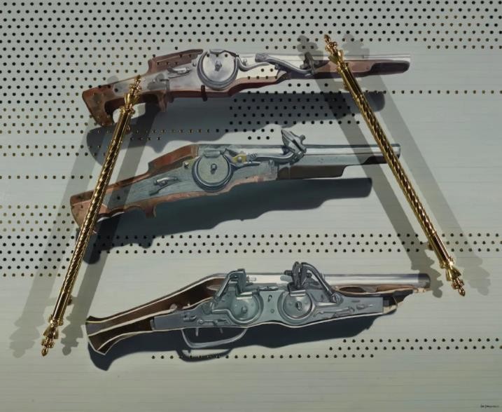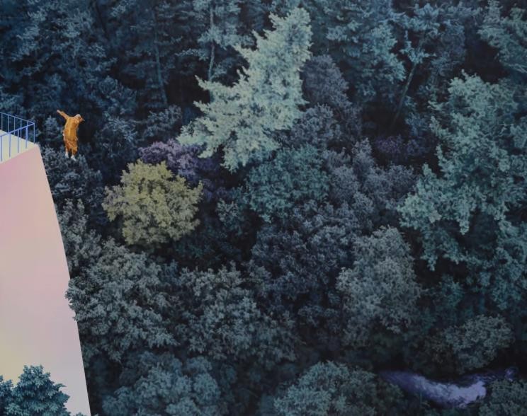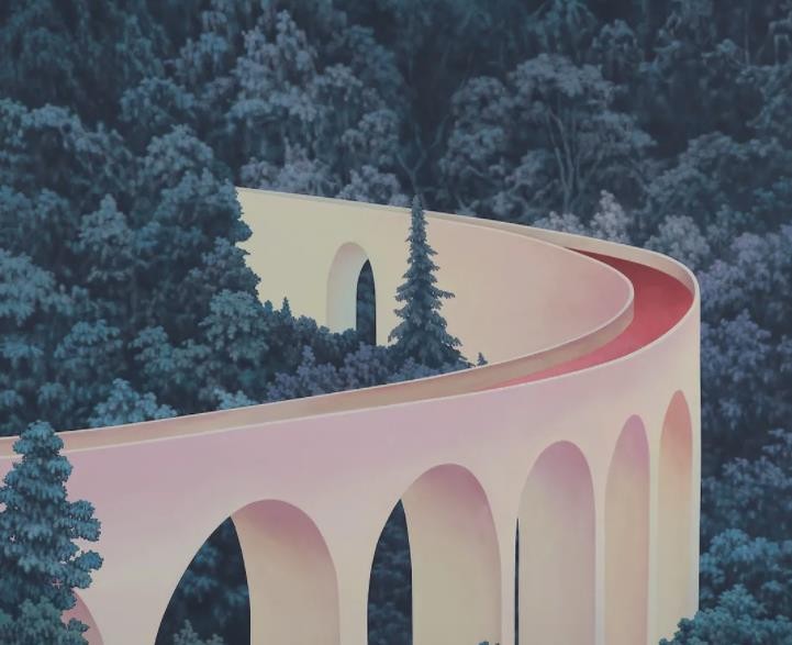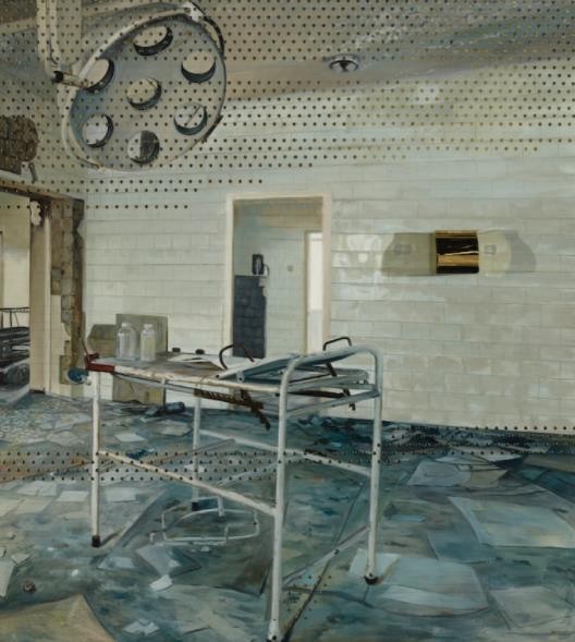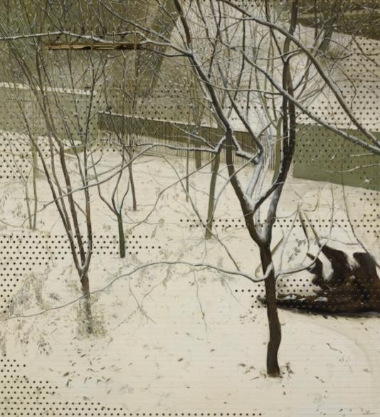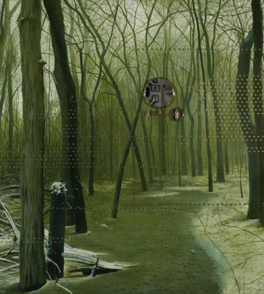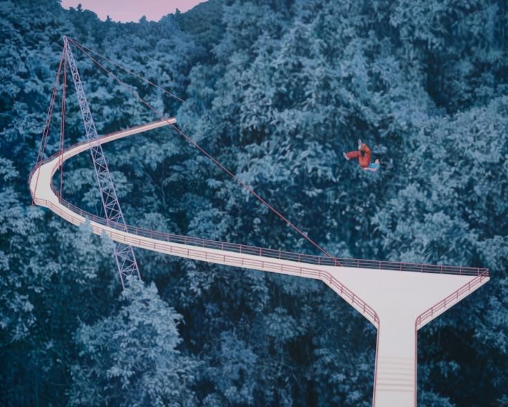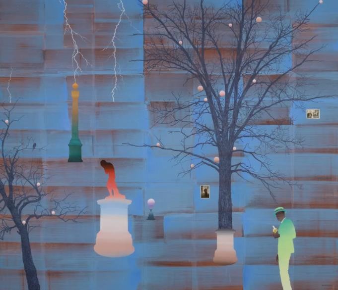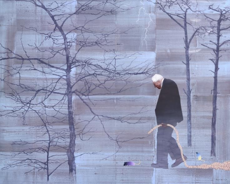 韩建宇早期作品中带有英雄主义色彩的表达暗示了艺术家对于宏大叙事的迷恋,但作品中肆意泼洒溃散的颜料以及猩红的色调可以视作对某种意义上崇高的消解。《同志》系列作品既是对英雄主义的向往,也是对某种明星的解构。今天的某种明星很多时候事实上也成为了被消费的对象,基于媒体传播的变异,以及意识形态的交互作用,在新的文化形态中往往表现为一种碎片化的历史形态,这其实很大程度上也是新一代艺术家的历史意识,他们对历史的认知不再局限于某种单向度的逻辑。这势必导向历史与文化的怀疑论,因之不难理解韩建宇之后作品走向带有浪漫主义色彩表达,所以作品《卢沟桥》既带有对历史视野的留恋与解构,又带有荒诞且现实的想象。在后来的作品《法海》与《禁区》中,这种历史叙事进一步隐退,以更隐晦的方式暗示着某些不可言说的若隐若现的历史碎片或者是营造某种带有隐喻性的现实时代图景。在韩建宇新近的作品《林中路》系列以及《场景》系列中,对语言的探讨与尝试、对个人情感世界与群体现象的分析,以及对环境与现实景观的反思成为了艺术家试图去探讨的问题。相对而言,艺术家开始更多地关注人之存在、社会的异化以及周遭环境的变化。