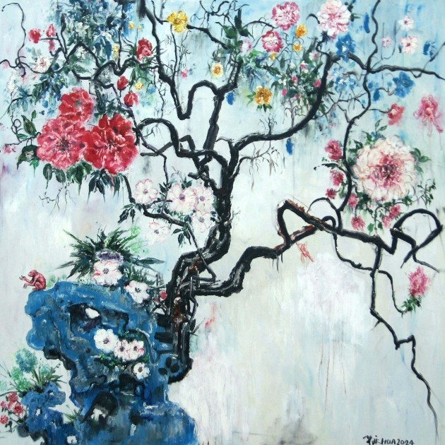 今日,当目光移至“华庆的花朵”,那饱含力量与野性的猩猩已悄然隐退,取而代之的是盛放的“一花一世界”。这并非简单的题材转换,而是艺术家精神航程的一次深邃转向。繁花灼灼,乍看之下确如盛世华章:饱满花瓣上流淌着生命最浓烈的色彩,是希望,也是丰饶的象征。然而华庆的花朵绝非浮泛的欢愉颂歌,其绚烂之下,每一丝脉络都隐伏着时间流逝的痕迹——那被光华悄然覆盖的褶皱与阴影,是生命无法规避的沧桑与沉重。这花朵是生命的双重寓言:它一面高擎着热烈绽放的旗帜,一面在根茎处默默承受着泥土的幽暗与命运的重量。