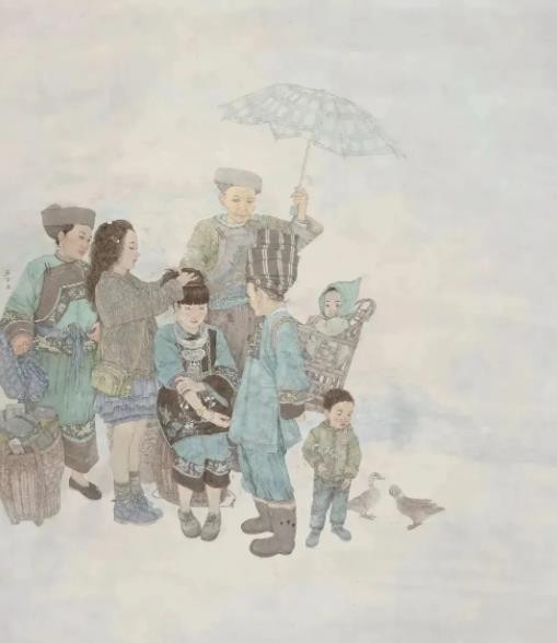 这次展览是她近十年来的创作,展现了她对工笔的研究与对写意的探索。玲子很勤奋,像地质勘探一样对研究对象进行深挖,以寻找工笔技法与精神内涵所能表达的可能性。《记忆》和《时光》系列作品她着重描绘对生命、亲情、人和自然的关系,清新质朴,并对社会发展与现代人的生活状态深入思索,画面延续了她以往画作中浪漫梦幻的气息。写意部分作品,她尝试将中国传统笔墨精神融入现代生活中,在传统精神与时代风貌中寻找一个恰当的表达。近些年的画作中,看得出玲子注重深入社会贴近生活,创作有了更多元的表现。如作品《三月》、《新长沙窑》、《早春》等,题材宽了,表达也厚重了。她从小我出发将自己放入社会与时间的长河里洗涤,文学、音乐、哲学都给予她滋养,激发她灵感。这些作品还只是她探索艺术中的阶段表现,艺无止境,长时间的实践与研究终会形成自己独特完整的面貌。