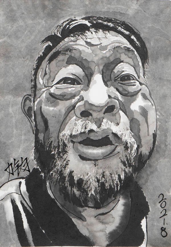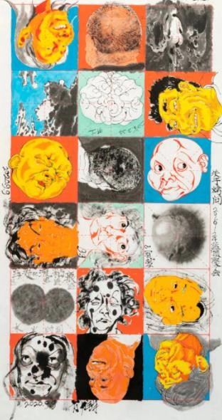 艺术界的朋友无不知道,作为燕赵出生的当代人,方力钧不仅重情义,也喜欢广交朋友,其中包括艺术家、批评家、收藏家与各艺术机构的负责人等等,这一点不少人都在《方力钧——100个人口述实录方力钧的艺术历程》【1】一书中谈到了,而且,他常常会在与朋友聚会期间以大特写的方式拍下一些朋友的照片——早先是用简易相机,后来则多用手机。起初很多人以为他是拍得好玩,没想到他随后以其为基本素材,画出了一大批水墨肖像作品。据艺术家自己介绍,之所以如此而为,一是由于他经常奔走于各地,选用很好携带的水墨媒材有利于他用空闲的时间作画;二是他以这种特殊的方式与朋友们进行交流,既画起来得心应手,也展开了一些必要的回忆。但明显与传统的写生肖像类作品是不同的:就画面构图而言,来得极为随意放松——有的甚至是从不同方向画出,很像一些画家在速写本上作画一样;而就人物造型而言,则具有特写、夸张与略带变形的特点,既在视觉上很像表现对象,气质也抓得特别准,可见他对所画的朋友都有着不是一般意义上的理解。其中一些带组合的图像,还携带着特定的故事、信息与经历,乃是研究中国当代艺术史的重要文献。比如《栗宪庭、张颂仁、方力钧像》就与著名的“后89展”的举办有关。而作品《2016-2018》【2】则将一些画家、收藏家、批评家、机构负责人画在了一起。我想,这显然不仅仅限于友情上的原因,更重要的是,这其中还包含了特定的历史信息。至于在表现手法上,则是层出不穷,让人眼花缭乱,不过,虽然手法不一,但都具有鲜明的方氏特点。即其既不是在传统写意画的艺术框架内寻求变化;也不是在徐悲鸿所创立的的艺术范式中寻求创造,故显得极为另类。过去我一直认为,造成如此局面,可能与方力钧对传统水墨与写实水墨的表现规范不是太了解有关,他大约是凭着聪明与大胆,巧妙地将油画与版画创作上的一些特点转换到了水墨创作上。