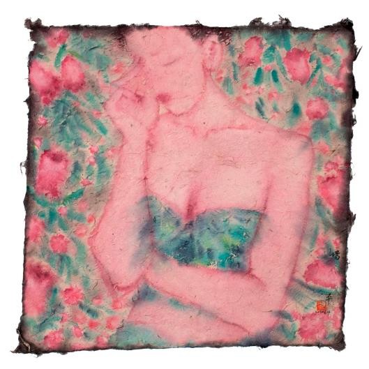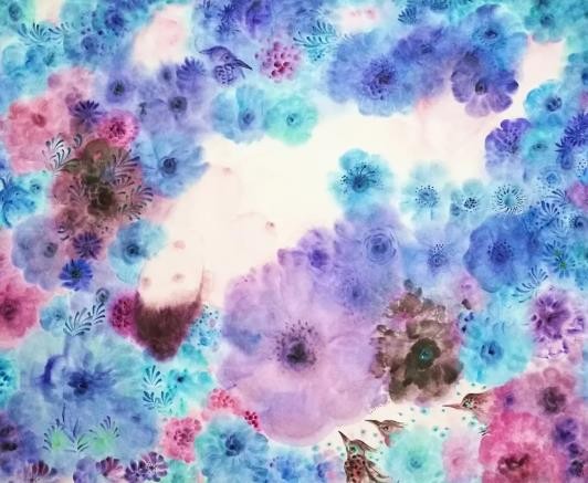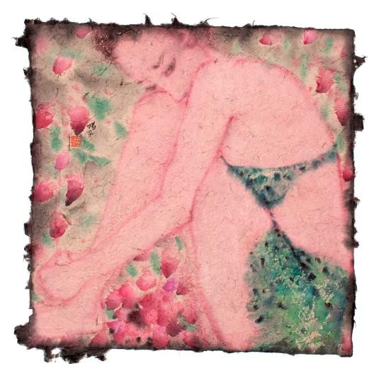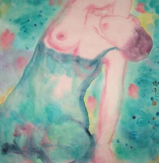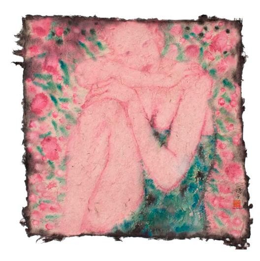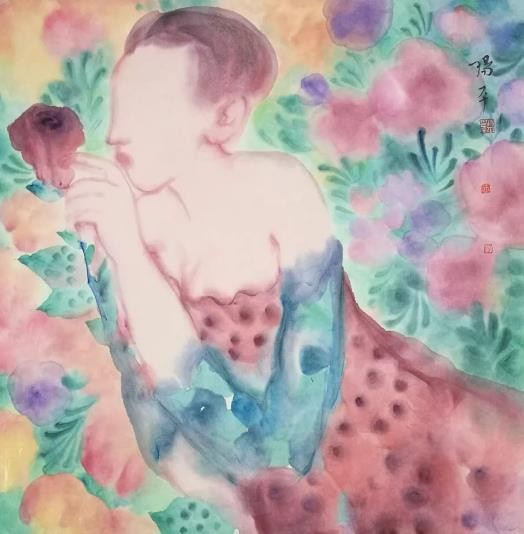 因为女人和鲜花都有美丽动人的特点,故古今中外的作家与诗人多喜爱用后者来托兴前者,举例来说,唐代诗仙李白笔下的“美人如花隔云端”就不仅是名作《长相思》中的核心句子,而且为千百年来一代又一代后人所传诵。就我所知,长期按自己创作逻辑前行的艺术家杨平,在从事艺术创作时,也经常会将女人和鲜花转化为具有个人特点的艺术图像来运用,但她并非仅仅是从纯粹审美的角度入手。由于认定女人像鲜花一样和生命、时间等因素密切相关,于是,她的相关表现也带有深刻的哲理意味。比如,她的代表作《时光》系列之三,即以组画的形式,描绘了一朵玫瑰花从含苞待放到灿烂开放,再到走向衰落的过程,由此也隐喻了女人漫长的一生,十分耐人寻味;而同样以组画形式出现的作品《时光》系列之一与之二可谓异曲同工,具体的说,上面一幅是表现一群为鲜花所衬托的女孩正在happy的画面,下面一幅则由一大组衰败的玫瑰所构成,也正是因为很好运用了强烈对比的手法,结果就视觉化的突出了随着时间的流逝,每个女人必然会由童年成长到老年的基本事实。我想,有了这样的学术背景,人们将能够更好理解艺术家杨平借这次名为“如花”展览所推出的作品。在我看来,艺术家于众多作品中,一方面强调了身体叙事,即通过青年女性的肢体语言表达了那些丰富复杂的内心世界;另一方面则借用绽放的鲜花,由衷赞美了女性娇美的姿容,生命华丽的律动。当然,也同时感叹了花期与人生的短暂以及岁月易逝的自然规律。由是也难免引起一些人联想到中国古典四大名著之一《红楼梦》中“黛玉葬花”的动人故事,以及南宋诗人陆游在《咏梅.卜算子》中的名句“零落成泥碾作尘,只有香如故”,还有明代诗人道敷在《落红》中的绝唱“虽含零落感,曾忆在芳菲”等等。我注意到,在一些作品中,艺术家还大胆以男女的交欢与鲜花的冶艳,热情呕歌了人类至深的情爱与生机勃勃的旺盛生命,而这无论是在金钱至上的消费社会,还是在疫情肆略的特殊情况下,都是极有启示意义的!至于在艺术表现上,我认为艺术家是在渲染生机盎然的鲜花与怀春的暧昧气氛时,有意将传统泼墨、泼彩的技法与西方野兽派、新表现主义等手法给予了很好的融合,所以形成了极具个人特点的艺术面貌。实际上,此举亦使她逐渐在中国当代水墨创作的大格局中占有了难得的一席之地。实在殊为难得,可喜可贺!