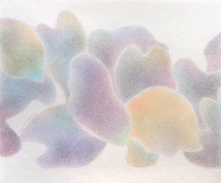 郭淑玲坚持着一年中大部分时间居住在帆船上的生活方式。帆船航海这种历史悠久的旅行方式完全取决于大自然的天气和风速,与岸上规律的生活相去甚远。风、浪与天气锋面决定了旅途的进程,驾驶者需要保持对大海节奏的高度适应,通过调整舵和帆来顺应各种变化。每一个海上新的黎明都仿佛新生。郭淑玲与丈夫带着这样的家向着大海的中心漂流,穿梭在珍珠般的岛国之间。她的船上有一方小天地是用来创作彩铅素描和油画的工作室。海洋、天空与云朵的光影和气息透过舷窗溢满室内的空间,自她思索与冥想的心流中滤过,最后憩于画布之上。在郭淑玲的创作中,大部分中幅与小幅尺寸的作品都是她在船上完成的。大幅作品因受限于狭窄的船舱,均在她位于费城的画室完成。