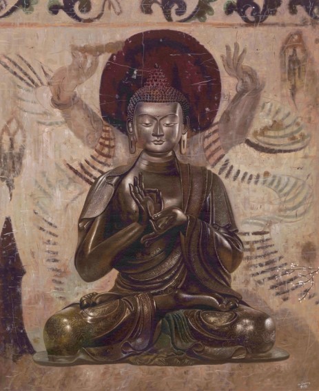 “梵韵吉相”佛像系列将中国文人山水画、花鸟画、敦煌飞天壁画等作为背景,而后以写实手法描绘鎏金佛像主题,再以桃花或木棉花点缀在画面的角落。在作品背景的创作上,米巧铭以油画技法皴擦晕染出中国古画中的主题,笔触随性自然,用色上追求古朴厚重的质感。米巧铭对古画的选择,源自对传统中国画精神内涵的探寻,如传统画中的“道法自然”,“明心见性”,以“禅心”及“禅境”,“禅趣”,“禅气”等。她用西方的油画技法来描绘东方的这些道法、禅心,用当代的笔法来体现历史的诗意,体现了画家对传统文化的重新解读与再创造。