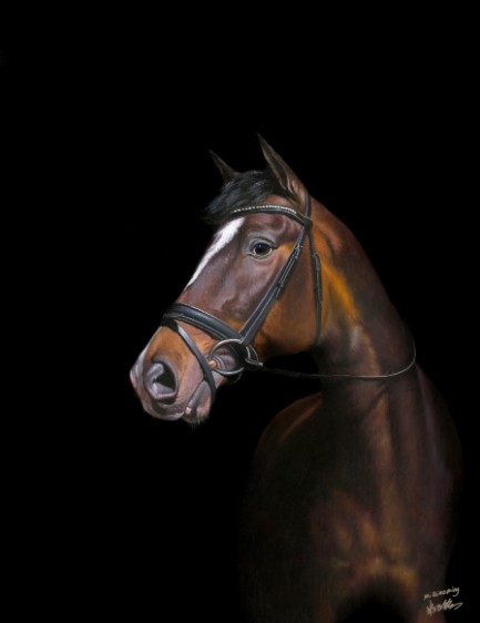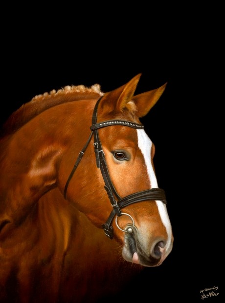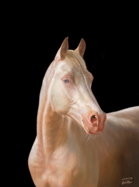“马”系列作品中,作者将超写实的马儿描绘的深刻细腻,展现了她对东方韵味与西方技法的巧妙结合,这些马或侧身回眸、或垂首沉思、或凝视前方,形态各异,刻画得极为逼真,马面上细腻的鬃毛,凸起的青筋以及脖颈上强韧的线条,有质感的肌理,凸显了画家深厚的造型能力及敏锐的感知力。米巧铭以饱含传统意蕴的用笔,细腻的描摹出马的各种生动传神的眼神,或惊奇、或淡然、或坚定,充满灵韵和生命的力量。