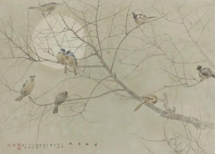徐熙和黄荃是五代时期花鸟画的两位典范,他们的绘画风格及审美情趣对后世画家产生了深远影响。邹传安先生曾感叹画坛“只今依旧识徐黄”,也从侧面反映出他对传统工笔花鸟画的坚守。他几十年如一日地致力于花鸟画创作和研究,深入传统,走出传统,继而又回归传统,自由地游弋在当代和传统之间,将个人审美趣味与当代绘画手法进行了有机的融合,使传统艺术焕发出时代新机。他这一时期的作品摈弃了标志性的泼彩背景与主体物象相融合的手法,用色更清淡古朴,更强调线条的写意性,笔墨之间流露出更多深层次的思想情感及人文关怀,体现了其对人生岁月的思索,展示了其理想中的“花鸟圣地”。