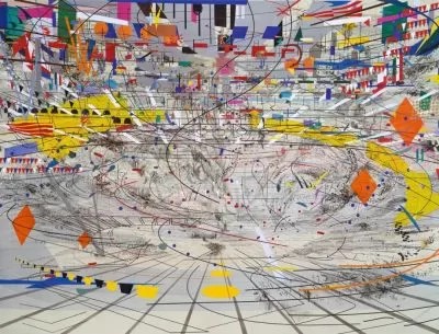 巨型尺幅、带有动感和爆破能量的绘画一向是梅雷图艺术创作的标志性特色,通过铅笔、钢笔、墨水、颜料在层叠的丙烯背景之上的互动,梅雷图执着地在平面中构建和开发多维立体空间。