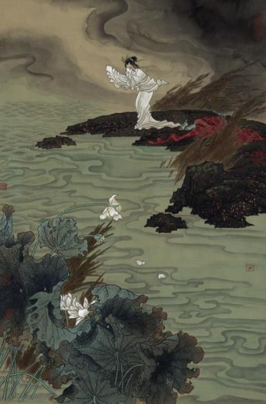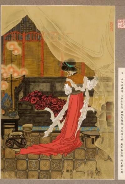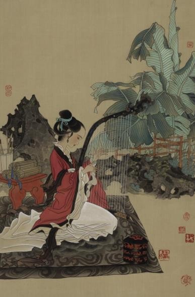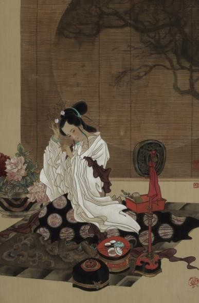 萧玉田先生以“诗意画”饮誉画坛。他不但精擅工笔艺术语言,而且谙熟古典诗词并深刻感悟其意境,汉乐府、唐诗、宋词、元曲中的名篇成为他想象与寄情的源泉,以精湛的工笔技艺将相对抽象的诗意、词情、曲境,转换为工笔画的形、色、空间,升华为饶有诗意的视觉形象,通过艺术的语言与手法对古典诗词意境进行再阐释。在其笔下,诗情与画意穿越时空而汇聚为一种亦古亦今的新意象。可以说,他的诗意画是当代艺术家浸染了古典文化精髓的再创造,用当代审美为古典诗词赋予新的想象空间。