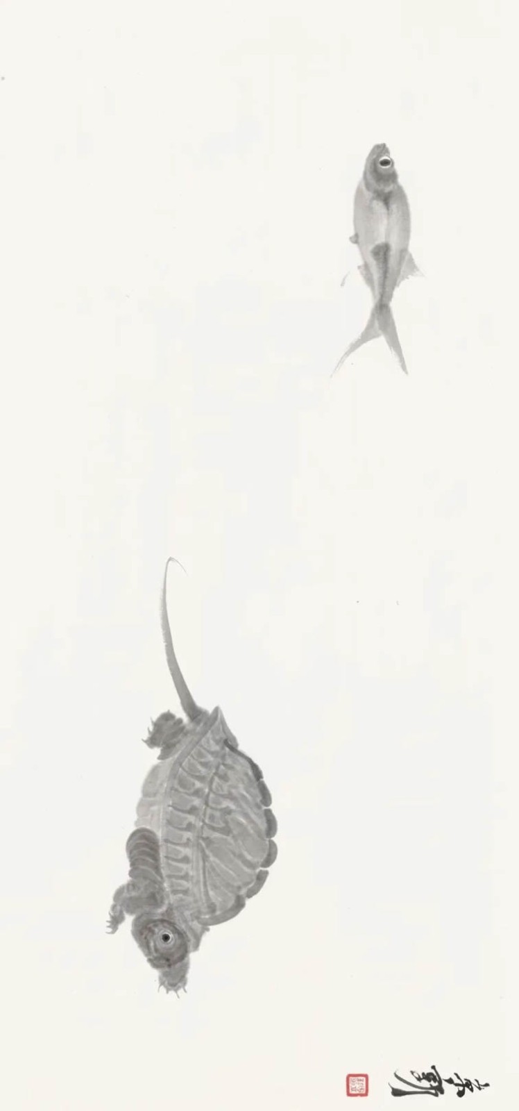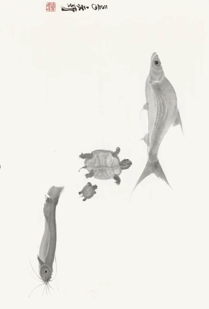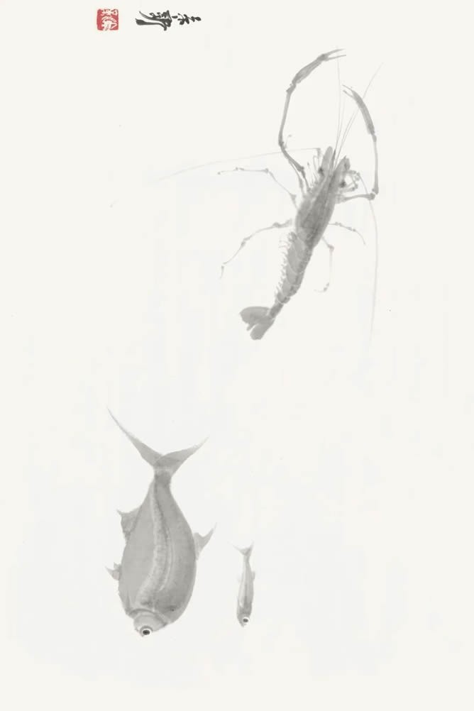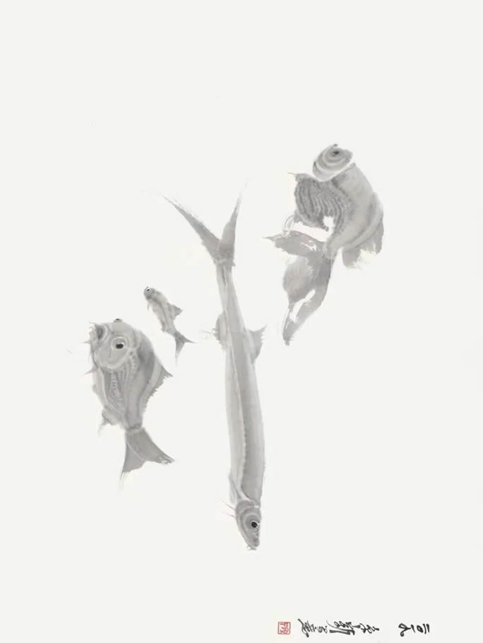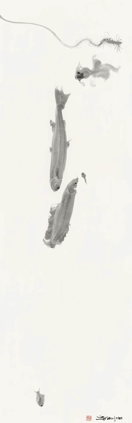 “有鱼”系列,正是这一理念的生动注脚。画面中品种各异的游鱼在淋漓的水墨氤氲中,化身为笔墨本身,其结构、姿态与动势,全然由高度概括而又力量内敛的笔墨构成。画家舍弃了繁复的细节雕琢,转而专注于笔墨语言的本体表现力,享受在单一主题与简约工具中不断生发、不断优化的艺术旅程,使观者直面其笔下所构建的一个纯粹而充满生命张力的水墨世界。这既是对中国画写意本质的当代诠释,也映射了画家返璞归真、直指本心的精神追求。