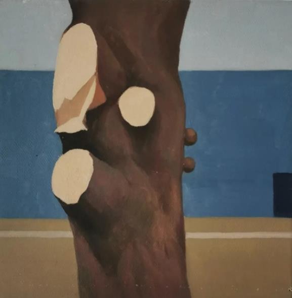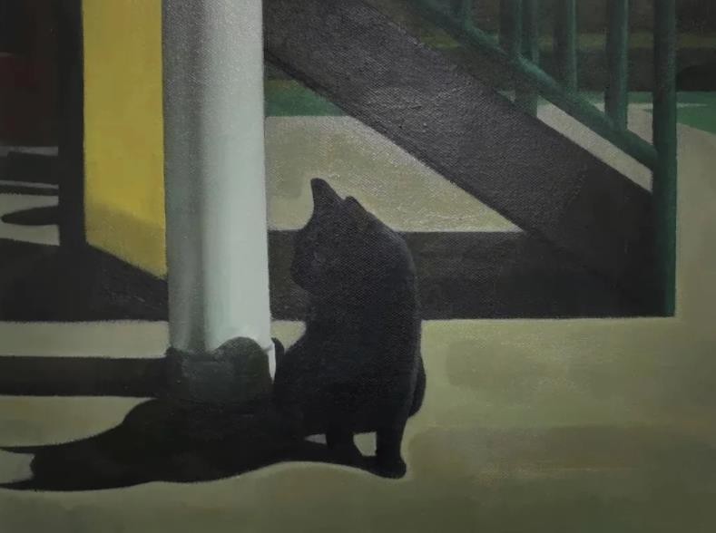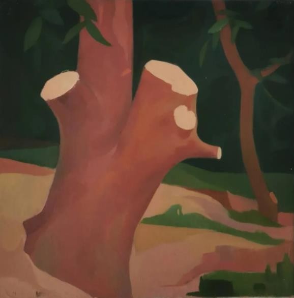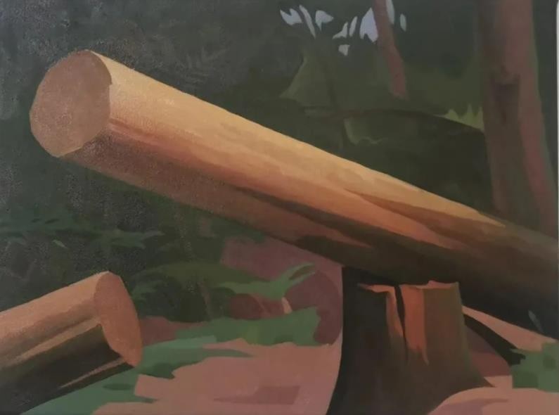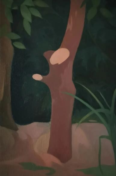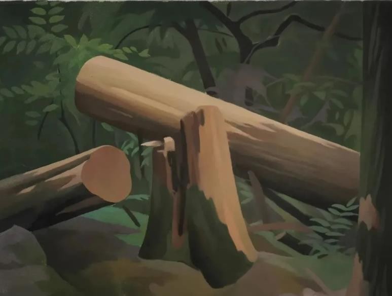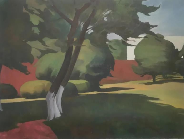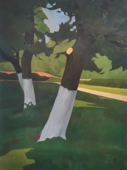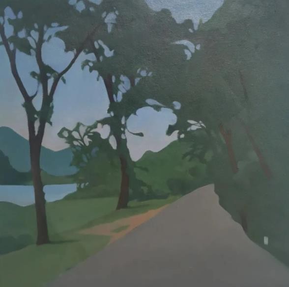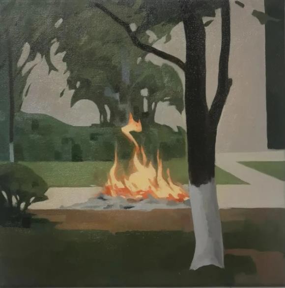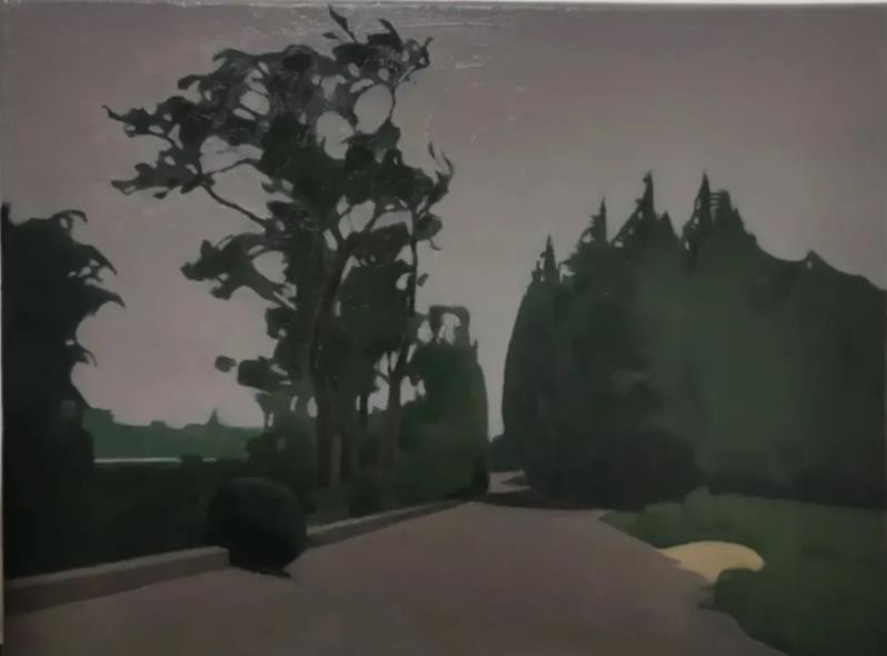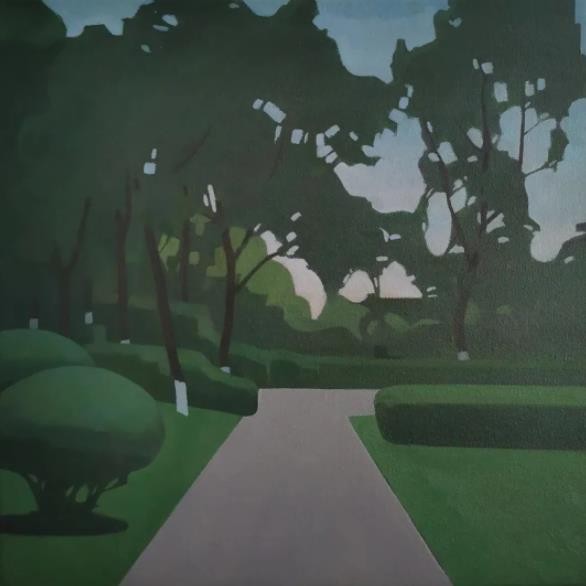 公园里树木被修剪过,留下枝干与切面的疤痕。湖面粼光闪动,反射着阳光,又倒影着山色,印着那青绿的美。公园外在焚烧,柏油路整洁干净,让人不忍踩踏。当然这些画面都被修整过,是李华波用画笔修掉的。原本画面里的人,处于画面中心的事物,在他眼中杂乱的东西,都被修去,留下人为修理过的风景。就像是道路两旁的灌木,园林里的树木,总有园丁去裁撤修剪,但这一切都被他偶然间遇见,并记录了下来。湖面轻动,树叶随风摇曳,这些夜幕下的景色和李华波说话的语调一样,平静并让人安心。