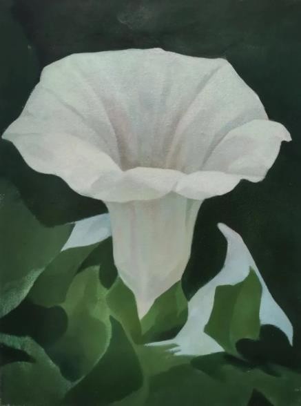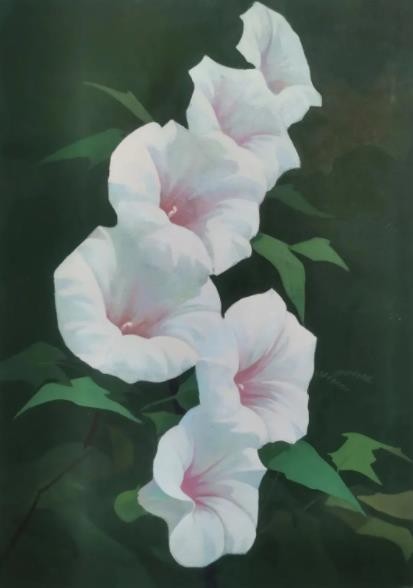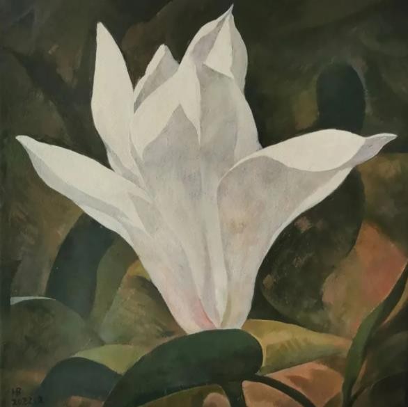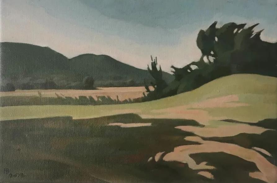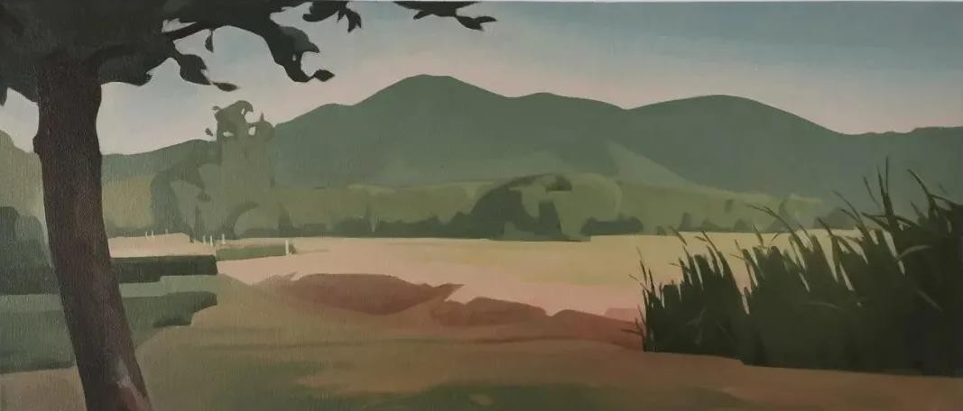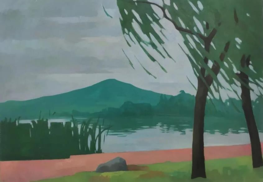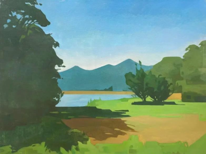 画面中没有一个人物,是画家刻意删去了,他画的那些树,被人修去枝干,更加自然,留下的是我们在意的,而失去的也会以另一种方式归来,在画面中,潜伏着一段漫长的故事,蕴涵着流动的时间。湖边的草木,傍晚的夕阳,好像只有风能与之共舞,拂动树叶,没有了人声车笛,只有最质朴最本来的声音,淳朴自然。在这人头攒动的时代,谁不期待一份属于自己的宁静,李华波将这些选择在画中实现,画制一份不期而遇的景色。