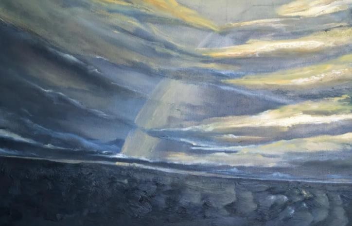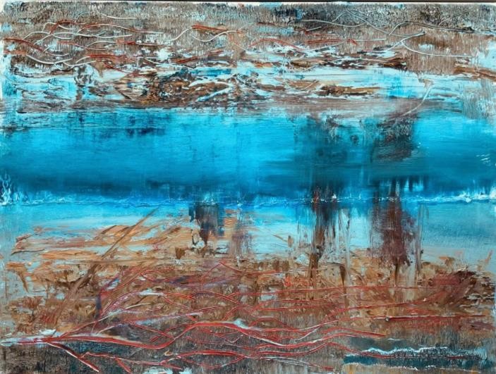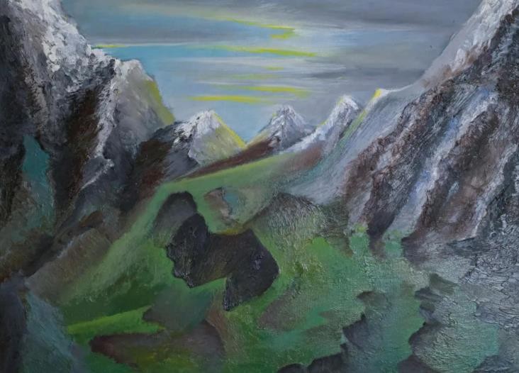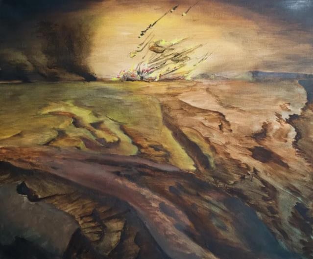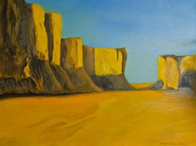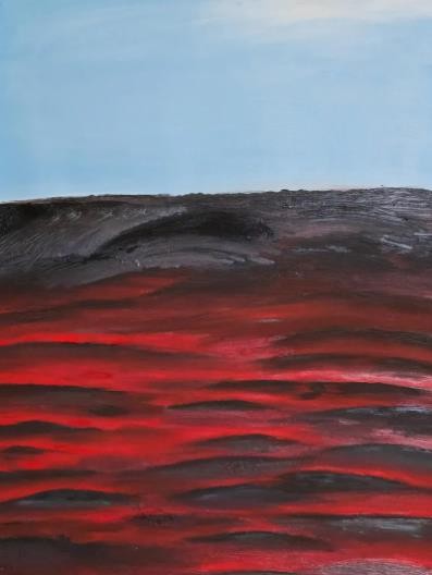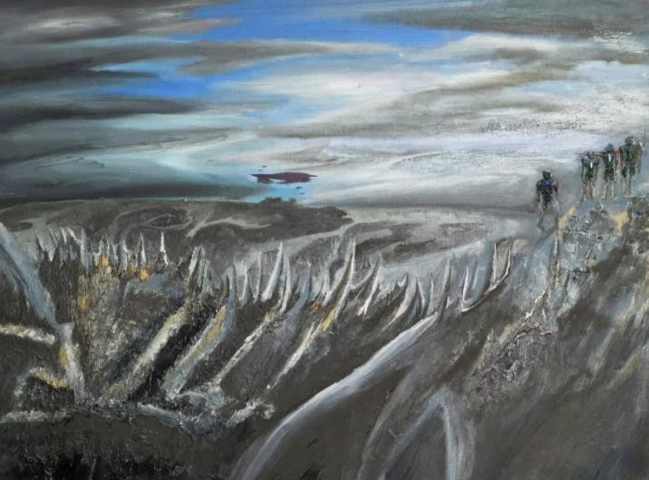 尽管是采用了油画材料和工具,部分作品也强烈呈现出一层表面的"现代? 西方? 抽象",但是其作品的精神属性却极其隐晦地展现出"中国内核"。因为,他这些风景题材的作品显然不是以西方式"写生"为创作方式,更不是以表现"光影"为目的,倒颇有几分云山墨戏之意,"山水之志,烟霞之侣"。个别浓重魔幻现实主义风格作品的内里,竟隐现出"大漠孤烟直"的意蕴。
