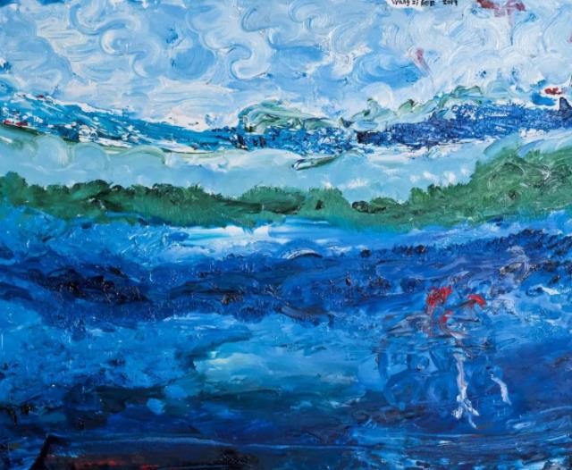 Despite the use of oil painting materials and tools, and the modernity, abstractness, and western features that some of his works may display, Wang Ziren's works are essentially centered around the Chinese traditional culture. Obviously, his landscape works are neither created in the Western style of "sketching," nor for the purpose of depicting "light and shadow." Instead, he plays with a bit of the freehand style from traditional Chinese landscapes, "aspiring to mountains and rivers, befriending mist and clouds." Some of his magic realism works even have a connotation that echoes with the famous Chinese poem, "In boundless desert lonely smoke rises straight."
