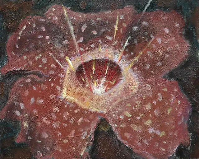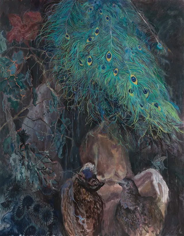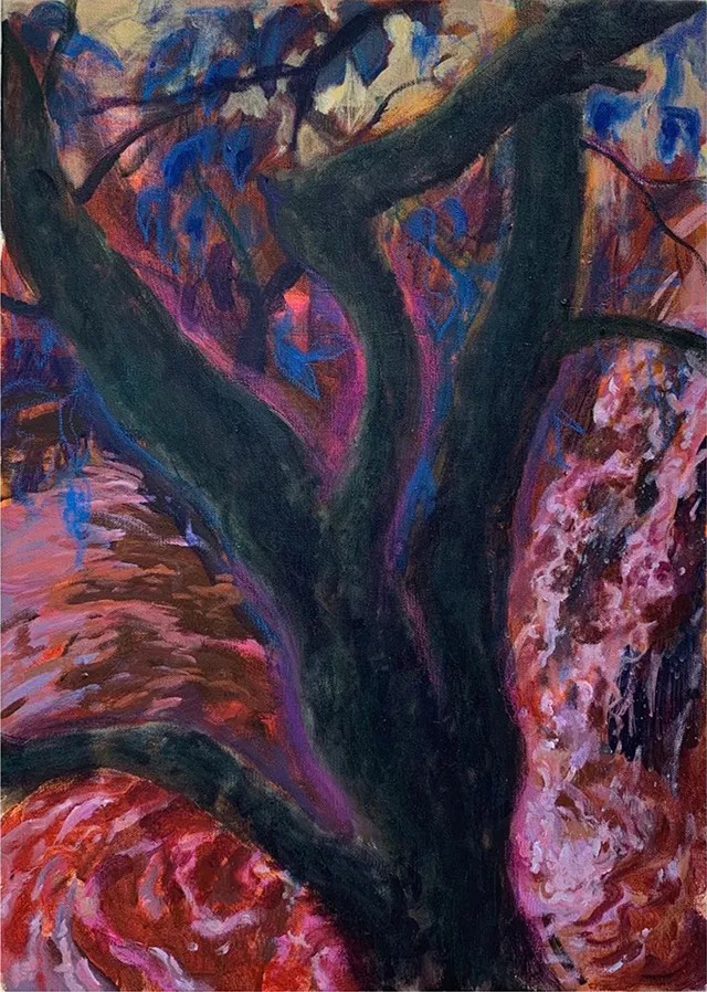 展览大致分为两个部分,课堂写生与平时创作。这些创作中散发的猎奇与迷幻气息,来源于我自幼观看的香港和日本早期的cult电影。在我日常的大尺幅写生作品中,穿插着一些不寻常的组成部分,而这些部分的产生,通常是放大了某个吸引我的要素,并与脑中积累的电影视效呼应所生成的。在这样的自发创作下,我尝试在观影时,不仅作为一个影迷,更是作为一个创作者,主动地去理解电影中的视听与表现手法,同我的作品构筑起一定的联系。于是,在当下的绘画创作中,我有意识地将多种矛盾元素融为一体,表达着个人的“恶趣味”。我试图以作品赋予观者一定的心理暗示与自发的联想空间。
