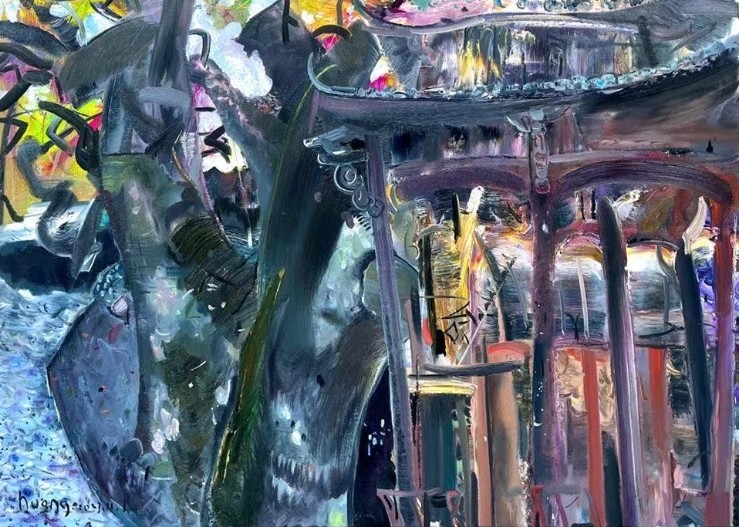 “山青花欲燃”,取自杜甫《绝句二首》的古典诗句,其独特的审美价值和深刻的文化内涵,蕴含着自然律动与情感迸发之间的诗性表达,即是一次视觉的召唤,也是一种情绪的隐喻。青色群山开满如燃烧火焰般灿烂的花朵,那是一种临近盛放、尚未彻底绽放的瞬间状态,凝聚了时间、情感与生机的交汇点。黄小华画面中这样的“临界之美”成为贯穿始终的核心线索,它既指向自然风物本身的静谧与波动,也承载着对故乡风景的凝视与内心情感的温存回望。