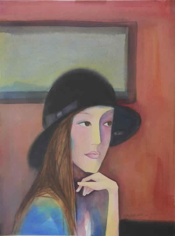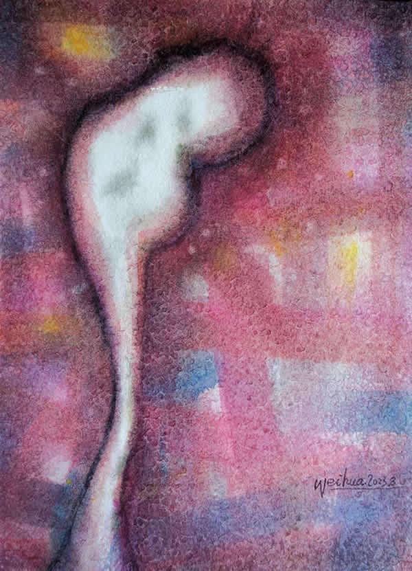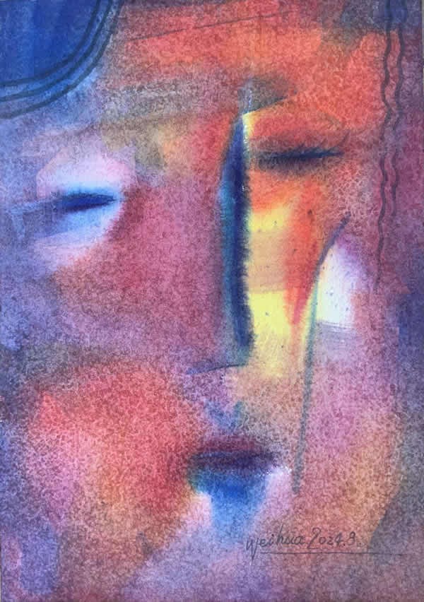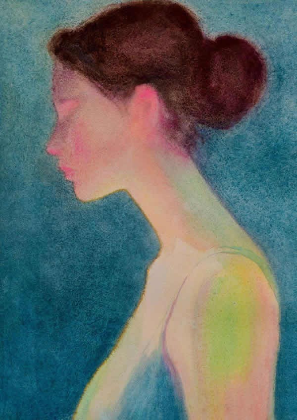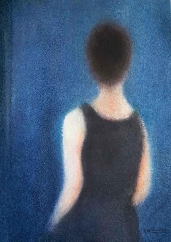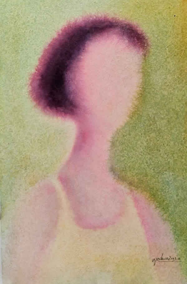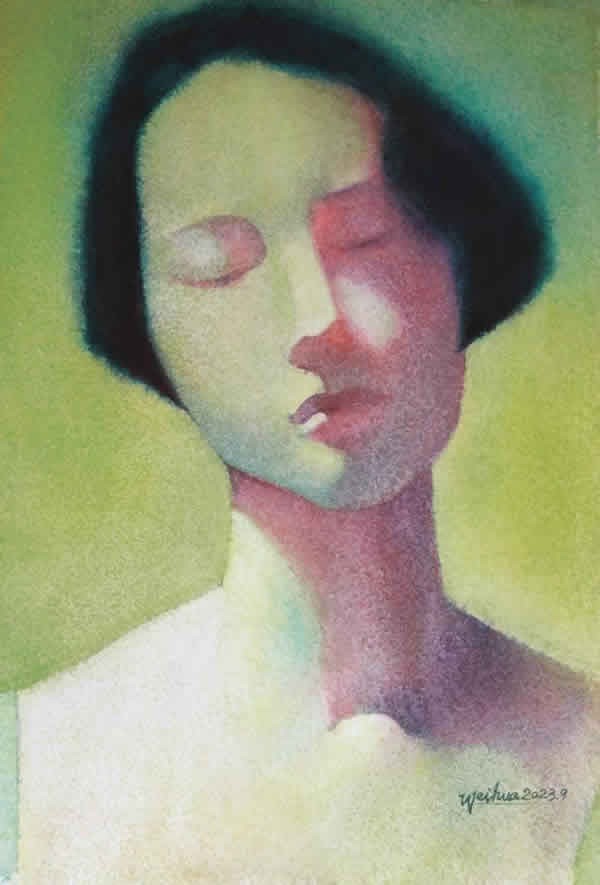 身为一名女性艺术家,我的灵感很大程度来源于女性主题,尤其是在现代社会中的女性群像。我欣赏当代女性展现出的那股静谧却坚韧的能量,也关注每位个体在特殊时期的焦虑、浮躁、不安……近期创作的现代女性人物水彩作品,意在表现出深邃迷离的朦胧之美。她们有迷茫,有彷徨,有思考,也有期盼,有知与不知之间的纠结。我有时刻意模糊她们的面容,给人以想像空间。整个画面朦胧但肌理却非常丰富,有着易安居士的婉约之美。