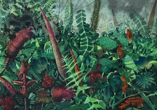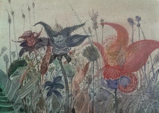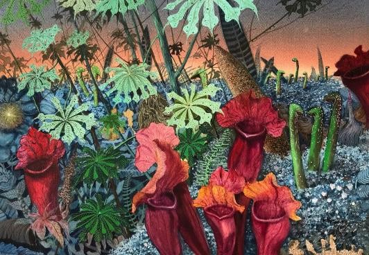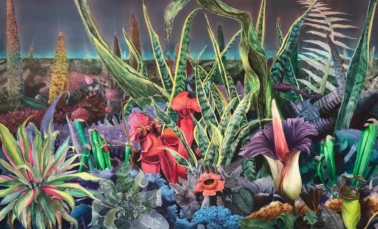 《花花世界》是周扬关于他的现实生活的写照及思考,他试图通过那些绚烂多彩、形态各异的花卉、植被去探讨自己的生活境遇。通过周扬的作品我想到了大学时期杜大恺先生提到的一个词汇“色域”。当时我的理解是关于色彩的区域形态或者是关于色块之间的对比关系。通过周扬的《花花世界》系列创作,我似乎找到另一种关于“色域”的解读。五彩斑斓的花卉搭建出关于色彩和场域的话题。色彩感觉是每个人都具备的天赋,或多或少或强或弱。用色彩表达情感的味道是周扬的优势。妖艳、诡异的用色,极大地烘托出似梦似幻的魔幻气息,其中既有孩童般的纯真也有成人世界的五味杂陈。