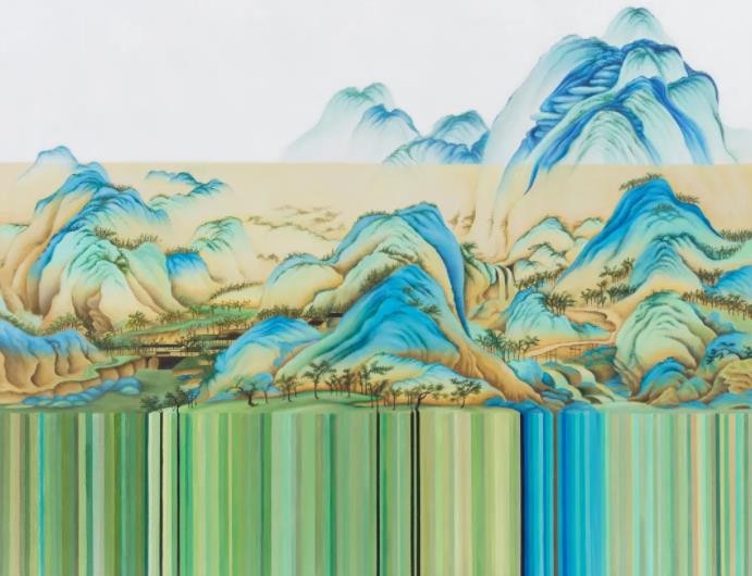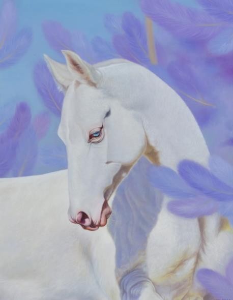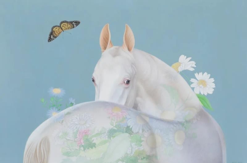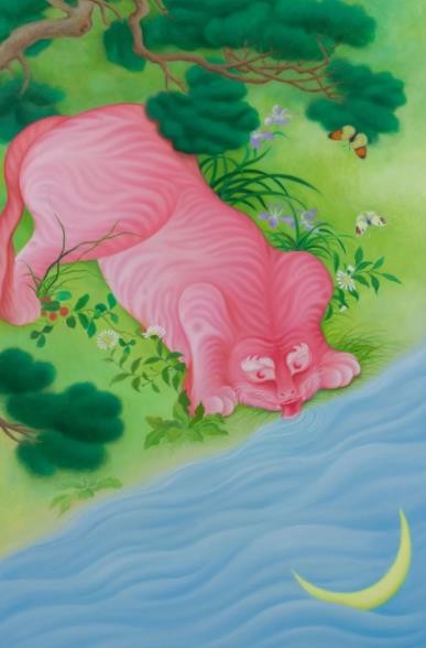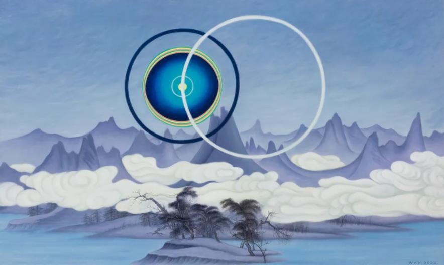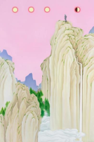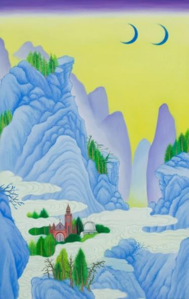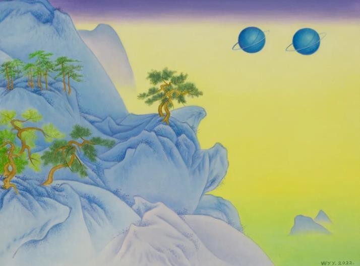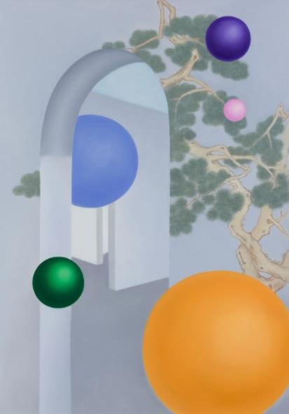 在魏阳阳绘画的内部空间,她建构了一个具有马格利特式的超现实主义风格的,同时具有东方梦幻迷人诗意的穿越空间。油性与水性,古典与当代,地景与宇宙,绚烂与平淡,平面与立体,几案与垂直,单色与玉质……阳阳绘画的诗意结合体现出一个女艺术家的细腻与冥想的气质,一种现代性的视觉反思目光和寓意。从本次展览的作品中,我们会看到一位艺术家在潜心绘画。这些油画的色彩除了体现出阳阳作为艺术家的细腻与天赋,她还把中国传统色中特有的青绿,黛色与粉色以油画的质感表现得透明而纯粹,甚至具有单色画的观念性。一层层地罩染式绘画,把国色的温润如玉,以一种近乎透明的美感传达出来。在这个疫情时代,也许正是这种沉浸式投入,可以让我们感受到绘画内在的愉悦。
