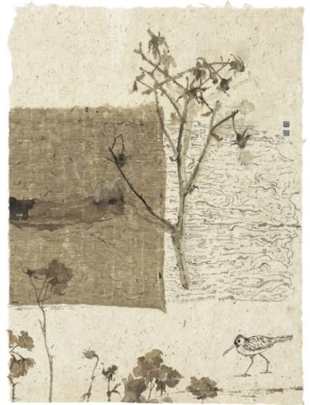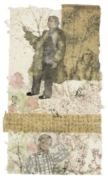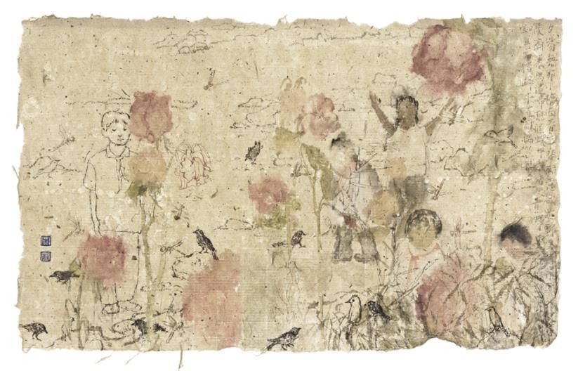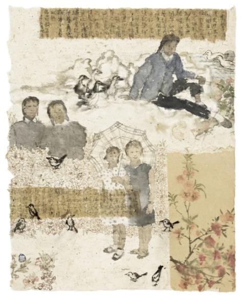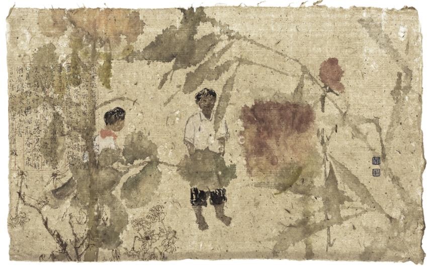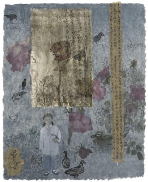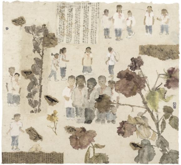 当然,在另一些作品中,罗敏也十分重视作品的观念表达。比如,在《川南忆》系列中,画面时常会出现各种类似于“拼贴”的色块与图像。这些色块既对画面进行分割,也制造了不同的视觉区域。图像既是一种提示,使其与个人的记忆或生活经历相关,同时,它让时间凝固,使其定格于画面。所谓的观念化,在于语言成为了审美的踪迹,既是一种视觉的提示,也让叙事的连贯性被迫中断。事实上,语言的观念化与语言转向的背后,实质源于罗敏自身艺术追求的变化。在语言与修辞的层面,罗敏希望既与传统相连,又使其具有当代气息。减弱社会学的叙事,源于对绘画性的倚重。对绘画性的捍卫,也是希望绘画走向纯粹,即绘画只关乎绘画自身。如此以来,绘画创作犹如修禅,如果剥离掉语言,那么,绘画完全成为一种个人化的行为。通过《花间集》《川南忆》《心经》等系列作品,绘画的推进本质上是罗敏不断与自然、与生命、与自我的一次次对话。虽然本次展览以小幅纸本为主,但它们以点构成面,从微观出发,让我们可以近距离感受到艺术家的语言变化与创作轨迹。
