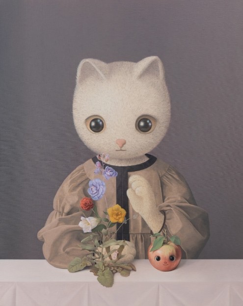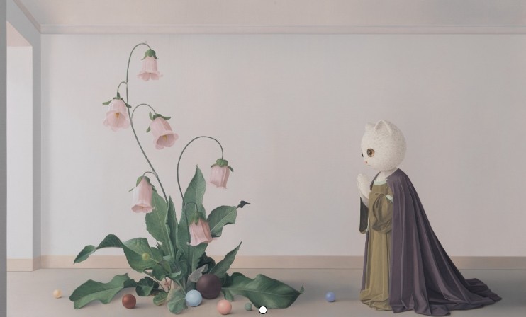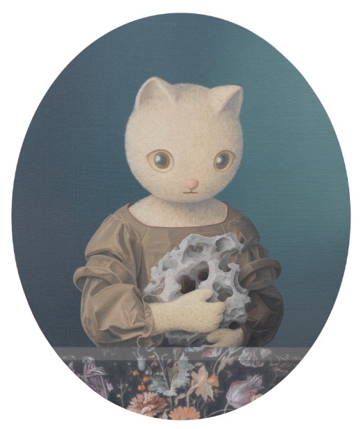 我一直对创作观察中“不是……而是……”的这种解读方式持有好奇,因为往往作品与创作者总是在某种程度上达到知行合一的境地,又总是在某个节点分离和上升,在这种情境下,张凯的性格,所处的环境,与纷繁的外界信息间所保持的若即若离的距离--以及纠集一体的汇聚--他的作品,成为了一种显化着外部世界但又持续着自我内观的投射。他也毫不掩饰对于中世纪和文艺复兴早期那段历史的向往和喜爱,再关联到他澄清、专注和稳定的状态,让人联想到他的工作和生活与在遥远时空中的前辈们一样,揭示着艺术家个人化的创作习惯和癖好,偶尔展露出对外部世界观察的一隅,并日复一日地承受和享有着极致的独处体验。他与艺术史中的大师们对话,格外钟情于维米尔,在工作室不起眼的角落里,摆放着一张他曾经临摹的《倒牛奶的女佣》,这件荷兰小画派的经典之作,好像是在无意间提示着张凯创作时画面构成习惯的来源,如同这一流派的特征一般,张凯的创作画幅不大,画面简洁柔和,且焦点平均。不同的是,张凯的创作中并不常见风俗画的内容,所描绘多为高贵与神圣的布景,配合明亮柔和的色彩、严谨的光影关系与四平八稳的构图,纵使画面中的主体总是一如既往“可爱”的猫和兔,也使张凯的作品透露出近似新古典主义作品的气质,一如大卫的《马拉之死》般理性和庄严。