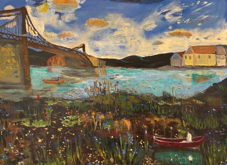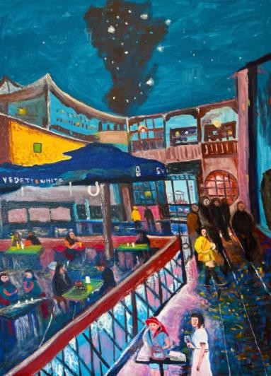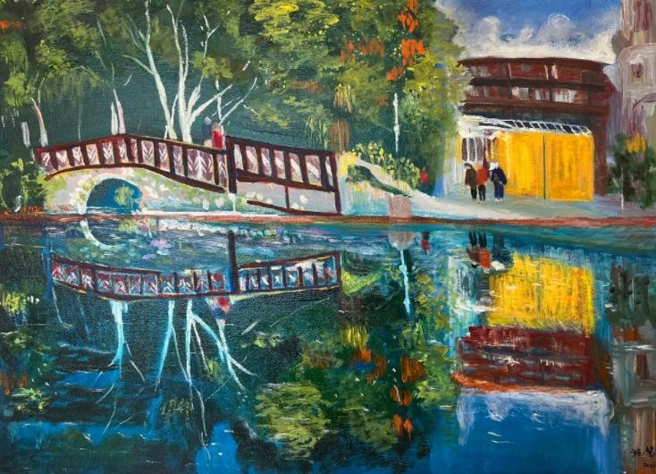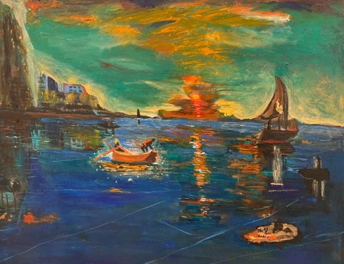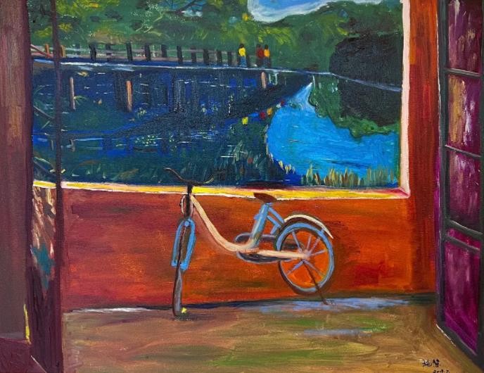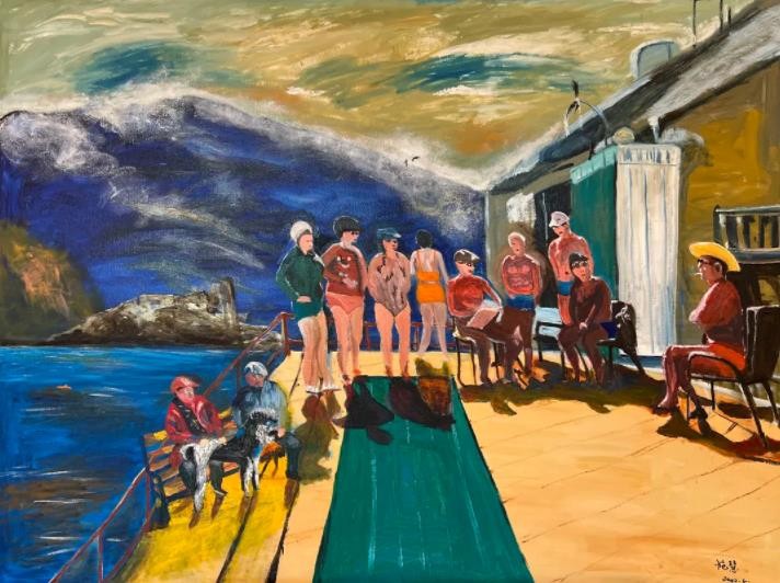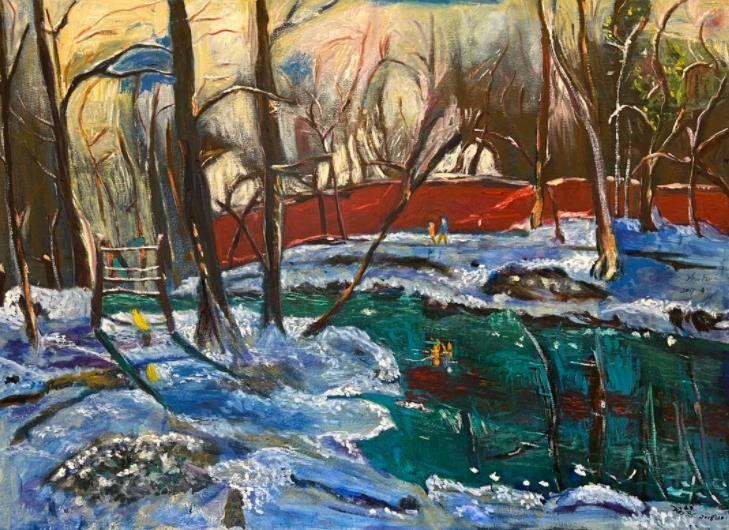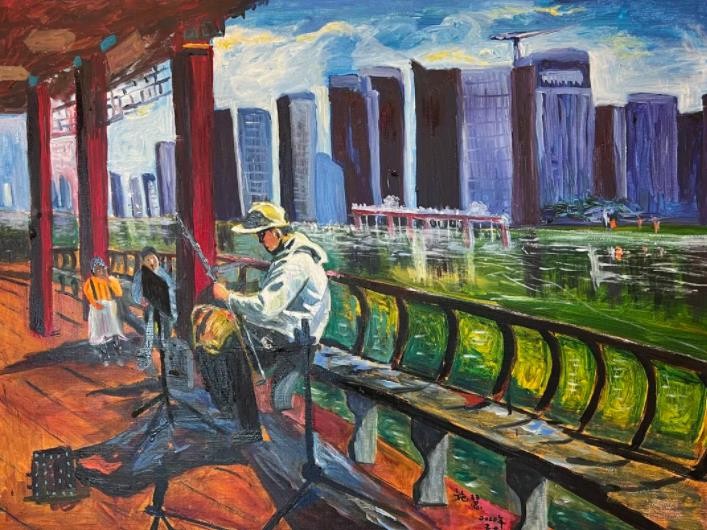 转眼到了2019年,我收到施慧先生画展开幕的邀请,到现场才得知这已是他的第三次个展。自此也见到了施慧先生本人,一个瘦小精悍戴一副高度近视眼镜的还不算老的老头。展厅里数十幅油画,风景人物各异,我惊讶于画面色彩的张力和造型表现的有趣,与印象中的新手迥然不同。