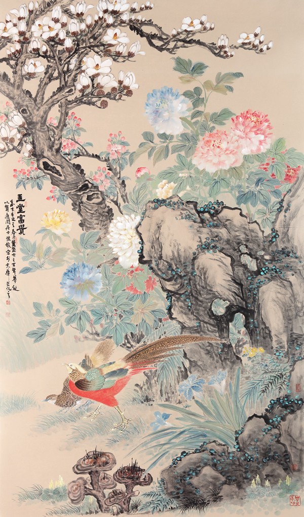 怀馥坚持以书入画,其作品有着清晰的传承脉络和时代特点,花鸟作品一类以水墨为主略淡彩,追求宋元庄重闲逸的格调;一类则是色彩浓郁,具有富丽堂皇的明清宫廷意味。山水作品尤为重视写生,师自然造化,在真山真水之间的留白,兼具诗词所表现的意境之美及书法所呈现的写意之美,与画面情景交融,妙趣横生。其格律诗体的声韵与节奏所隐含的炼句之功,与他追求的“雕琢见自然”整体风格相映成趣。