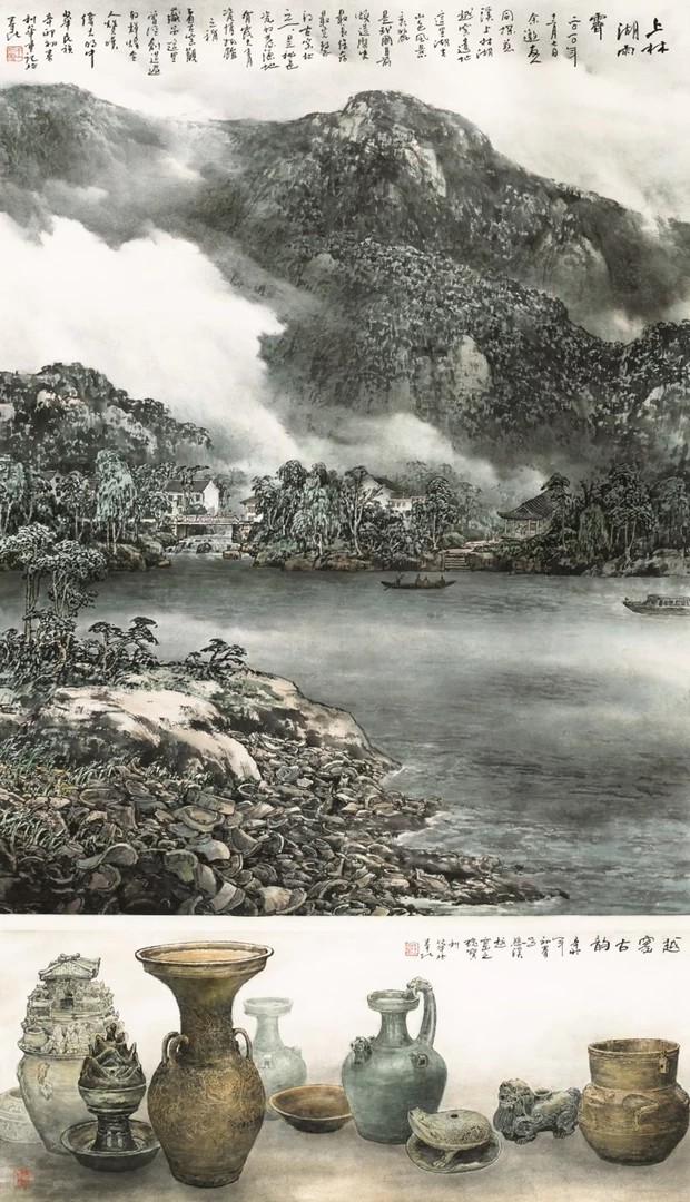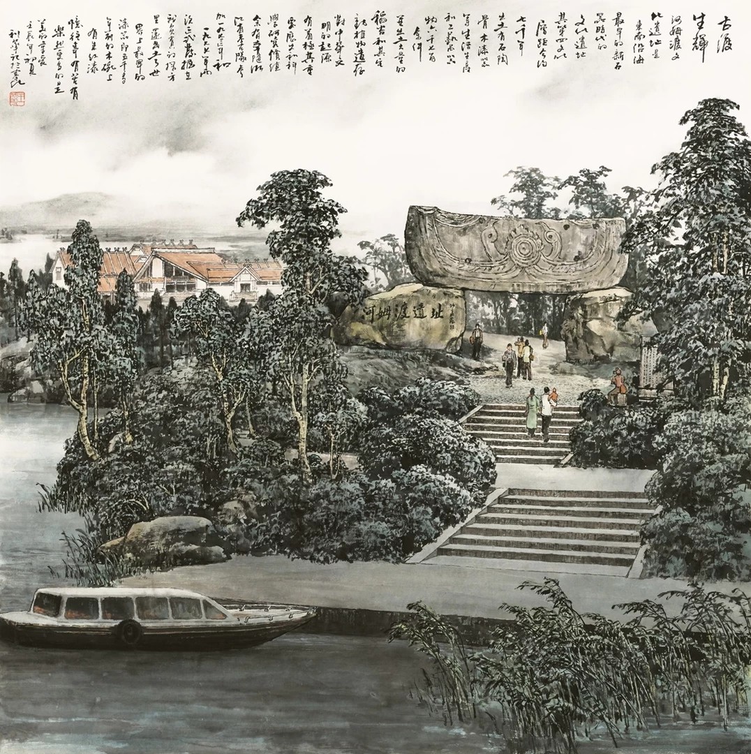 我这么说了,也这么做了。国际港口名城、东亚文化之都——宁波,俊彦辈出,文脉悠远,在中国文化版图上有着独特而崇高的地位。创作题材,我最终选定了代表这座中国历史文化名城人文灵魂的31处全国重点文物保护单位。他们真实地遗存于宁波大地上,其中有长江流域同为中华民族文化发祥地之一的明证河姆渡文化遗址,江南地区年代最古来、保存最完整的木结构建筑保国寺大殿,我国现存最早的私家藏书楼天一阁,世界文化遗产中国大运河南端的浙东运河宁波段,世界灌溉工程遗址它山堰,还有上林湖越窑青瓷遗址,溪口蒋氏故居等等。这些优秀文化遗产,世人有必要也有责任善待、保护它们,而艺术化表现和展示它们,那则是我们艺术家的光荣和使命。为此,我又度过了五六年艰难而愉快的坚持,相继以中国画形式将它们一一表现出来,出版了第三本“为家乡”作品集《甬城金名片——画说宁波全国重点文化保护单位》,并于2016年6月11日第11个中国文化遗产日,在宁波博物馆举办了同题作品展览。