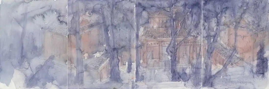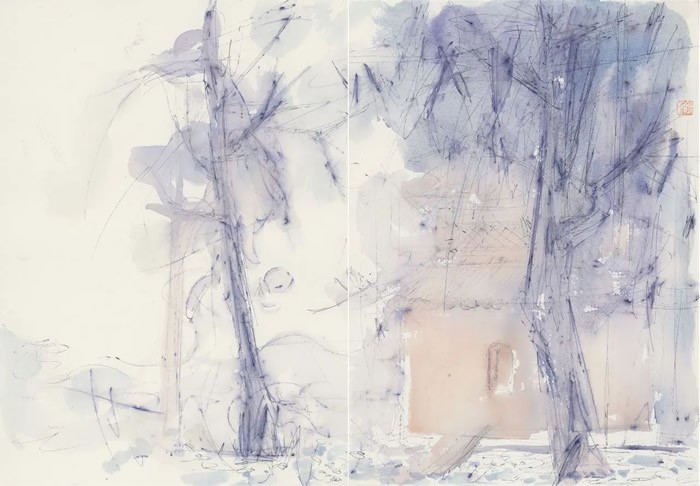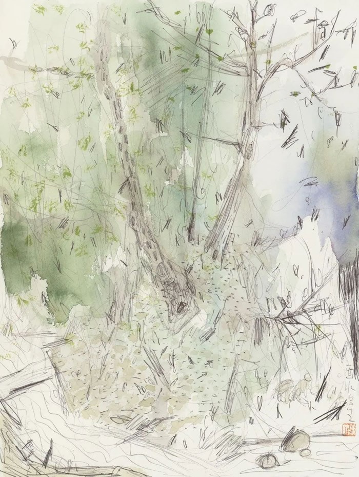 小尺幅的画面呈现也并没有限制住艺术家胸中气象的抒发,方寸之间讲述的仍是空山五百年和山水一浮生的故事,刘明波笔下的春来春去仍是那么诗意盎然、哲思充沛又婉转伤怀,空间叠加推远,感受细述拉近。山、云、风、雨、晴、火、溪、花、松、鸟鸣与钟声,闲适与禅心……勾勒出艺术家的精神世界图景,画面意境的营造更有意匠的经营,不同季节不同地貌的不同自然景观映射着刘明波不同的心境,以线条和色彩的旋律,交响出风景的诗性空间,展现绵绵不绝的动势与宽广无垠的静谧。流连于物象凝心于意象的提炼,描绘景色斑斓之趣。