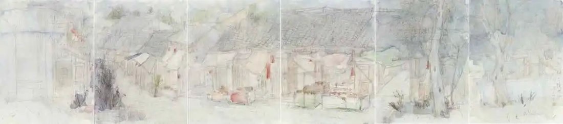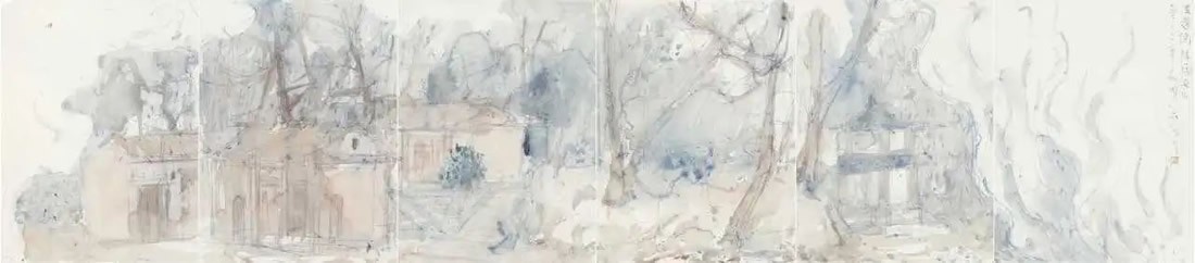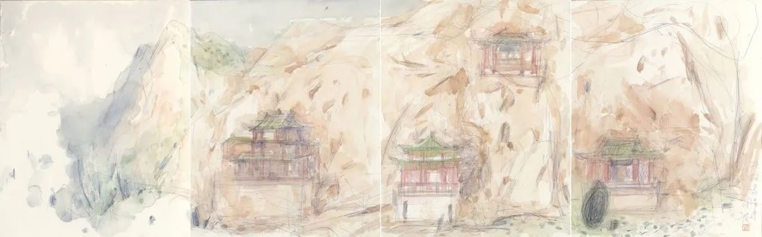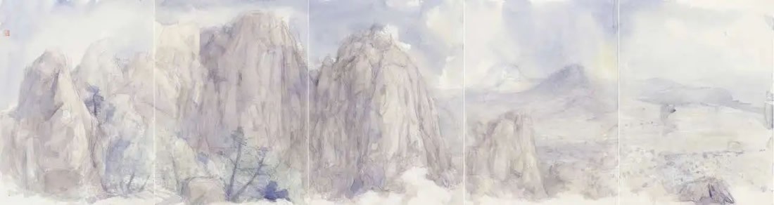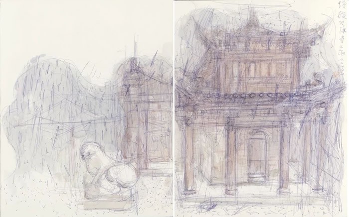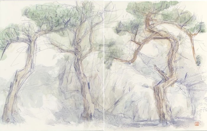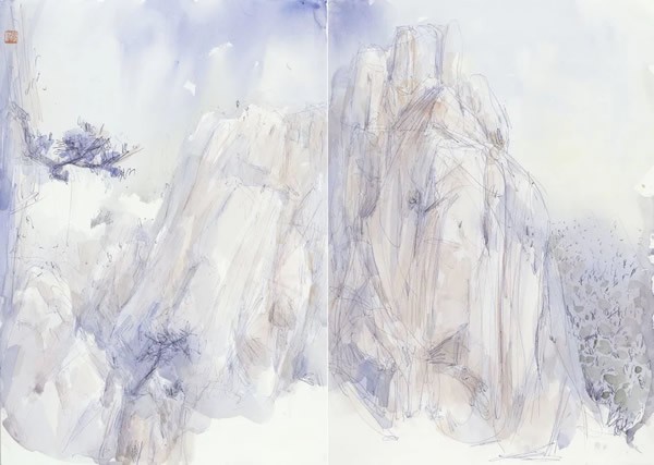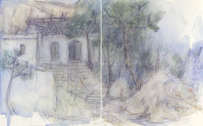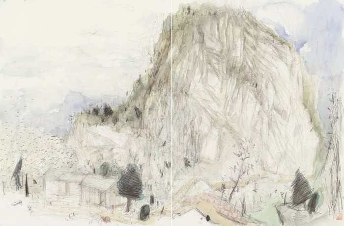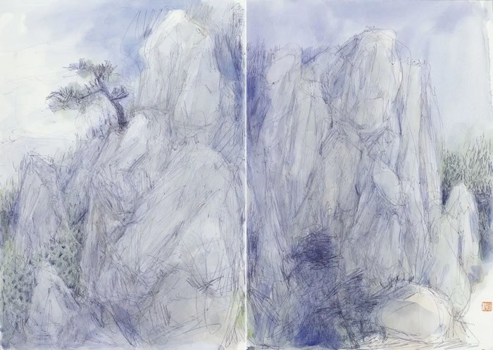刘明波的纸本设色作品来源于对生活现场的感怀,采用圆珠笔等手头易得的工具在纸本材料上挥洒,直抒胸臆表达对眼前景物对自己那一瞬间的触动。蓝天白云间春水溪长,苍翠欲滴中云雨蒙蒙,丹霞幽亭下心花放开,这些纸本作品记录了艺术家的足迹更记录着他的心迹,通过如电影般不断的转场和蒙太奇的组合我们似乎窥见并进入了艺术家内心的角角落落,体味着刘明波心里的丝丝情愫。