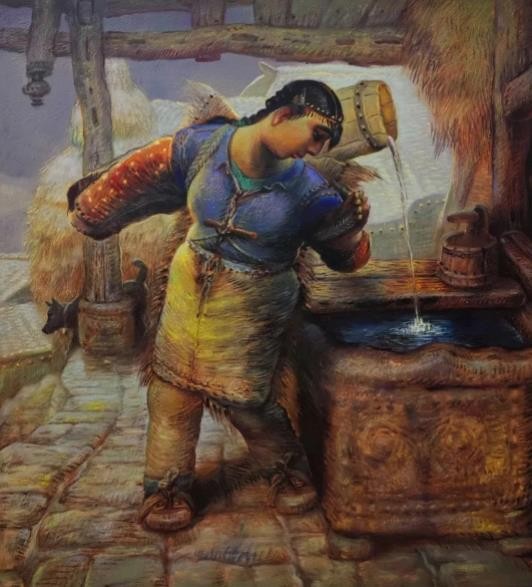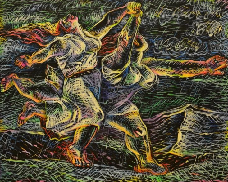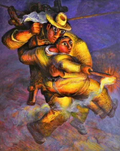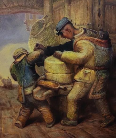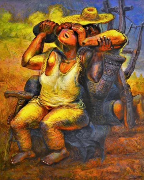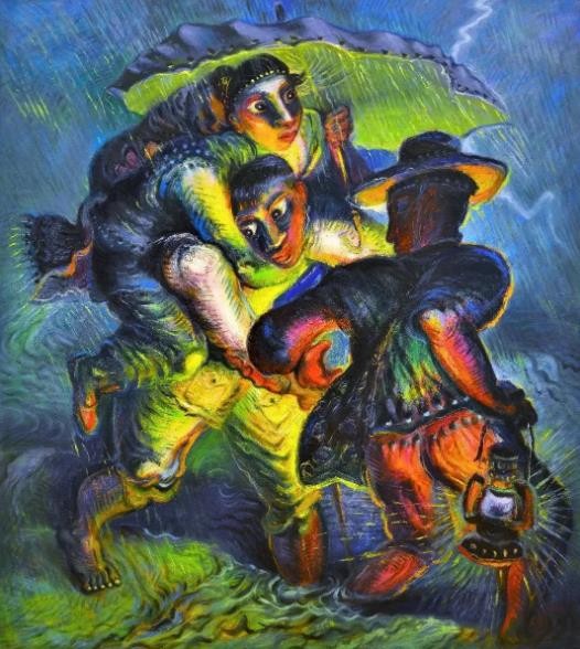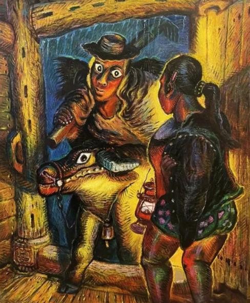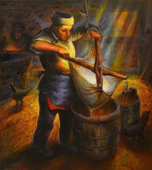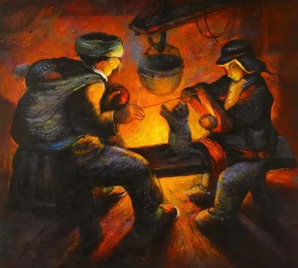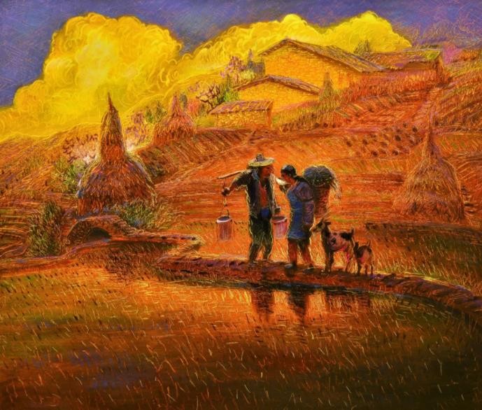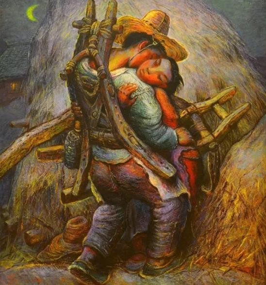 如果说前4个单元以历史与时间线,呈现了四个不同角度的历史长镜头。之后的6个单元,则以文学小故事和空间地点的手法,讲述了罗中立和大巴山之间不解的情缘。“劳动”系列,开宗明义地指出罗中立对于巴山的现实立场和人文关怀,对于朴实的农民和辛勤劳动的歌颂。“夜灯”又将主题引向大巴山的精神和信仰世界。“爱情”单元是罗中立“重返人性”的题眼,对原始欲望的坦然宣告。“乡村旧事”以消逝的光感、对旧题材的反复描述,重现了巴山正在消失的传统。下一个单元中早期连环画和近期组图的对比,从文学故事转向语法的分析。最后,“与美术史对话”呈现了罗中立对现实和题材的超越,对个人和历史的回溯。
