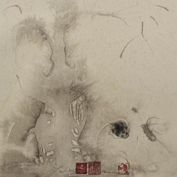 他这样的炭笔类的书写和水墨的渲染有机的结合是中国现当代水墨的另辟蹊径。另外,我还注意到他在宣纸上有大量的刀刮、蹭擦之后留下的纸屑和纹毛,被他用胶沾附在宣纸上,“机理”产生了别样的表现效果,极具表现力。在艺术语言上,西方的塔比埃斯这样一群艺术家,对物质媒介的新表现性能为艺术史带来了很多新发现,在这点上智龙完成了他的新创造,有他新的贡献。智龙在长期油画创作中培养了良好的绘画语言的敏感性,从他涉足水墨作画才四年,可见,他对水墨悟道之快,自然要归功于油画艺术素养的长年积累。可以说,他是大家董其昌说的“一招直入如来地”的那样一种艺术家。他顿悟,所以他能很快地把握水墨媒材的特质本性。这些,各位可以在他的原作中观看到