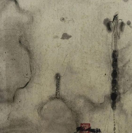 宣纸的多层托裱,据我所知国内尝试者甚少,从古到今。这样裱过之后就可以产生一种非常特定的机理效应。另外,就是笔的使用。大家都知道,我们大陆的现代水墨晚于台湾三十年,台湾的现代术墨的先锋最早的就是吴越和东方。我们大陆就是刘国松。刘国松当时提出要从传统水墨中走出来,他打的旗帜是“要革中锋的命”。因为中国的传统水墨画非常讲究书写性的笔墨,讲究笔墨至上。刘国松革了中锋命之后,很长时间对大陆的新水墨影响很大,我想,智龙是从这条线上下来的。智龙在这方面很自觉,他不一定想到刘国松的艺术主张。但是,他置毛笔于一边,选择硬质的各类工具“笔”,这样一个艺术家的创造枷锁很自然的打开了,他彻底获得了传统画家不可能得到的一种书写性笔墨表现的自由。所以说智龙创造了一种新笔墨,一种当代意义上的新水墨绘画。